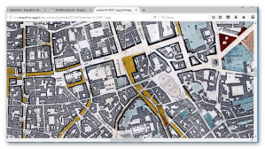 Da notare che i progettisti nello stesso P.R. ideano anche quella che diventerà in seguito via dei Fori Imperiali (in giallo le costruzioni da distruggere) come un prolungamento dell’asse viale Manzoni – via