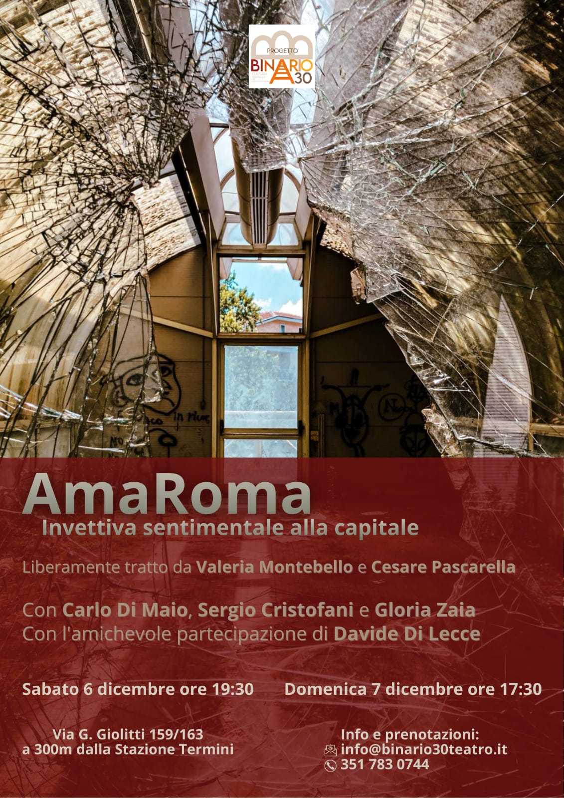 Binario30 via Giolitti 159 Biglietto intero 14 euro, ridotto ( pensionati e under 25) 10 euro tessera associativa 2 euro info e prenotazioni info@binario30teatro.it mob. 351 7830744
