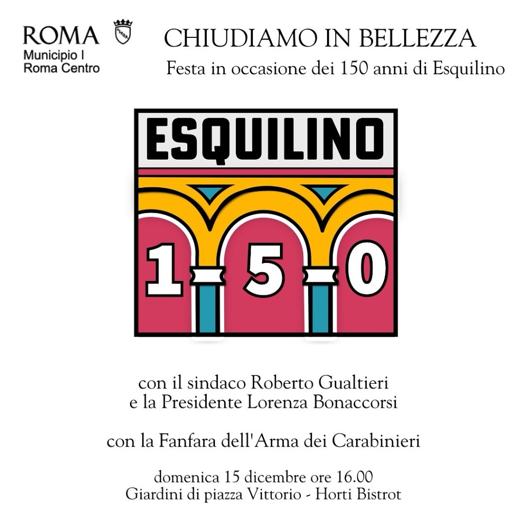 Tre mesi di eventi in onore dei 150 anni dell’Esquilino si concludono, domenica 15 dicembre, alla presenza del sindaco di Roma Roberto Gualtieri, della Presidente del Municipio Roma I Centro Lorenza Bonaccorsi e dei componenti della Giunta Municipale. Una lunga festa iniziata il 6 settembre ricca di partecipazione, cultura, sport, solidarietà e tanto altro in questa rassegna fortemente voluta e appoggiata dalle associazioni di quartiere e dal Municipio I.Tantissimi gli eventi che hanno celebrato uno dei quartieri più caratteristici della cultura e della storia di Roma. Il rione, nato ufficialmente il 31 dicembre del 1874 dopo essere stato scorporato dal rione Monti, conserva intatti i caratteri impressi dalla sua storia. È ancora oggi luogo di residenza e di accoglienza, luogo di scambi e di mercato, di passaggi e di transizioni. L’Esquilino contemporaneo contiene tutte queste funzioni.A chiusura di queste celebrazioni il rione ospita nel week end del 14 e 15 dicembre una serie di attività organizzate dalla cittadinanza attiva e dalle realtà locali. Previste visite straordinarie del Museo Ninfeo, dell’Accademia Costume e Moda, di Porta Asinaria, una mostra fotografica per i 150 anni di Esquilino ed un nuovo appuntamento sotto i portici di Piazza Vittorio con Esquilibri.Domenica la festa si conclude con i saluti da parte del sindaco di Roma Capitale Roberto Gualtieri, della Presidente del Municipio Roma I Centro Lorenza Bonaccorsi e dei componenti della Giunta Municipale, in programma alle 16 ai giardini Nicola Calipari di Piazza Vittorio bistrot Horti Magici, preceduti da un intermezzo musicale.