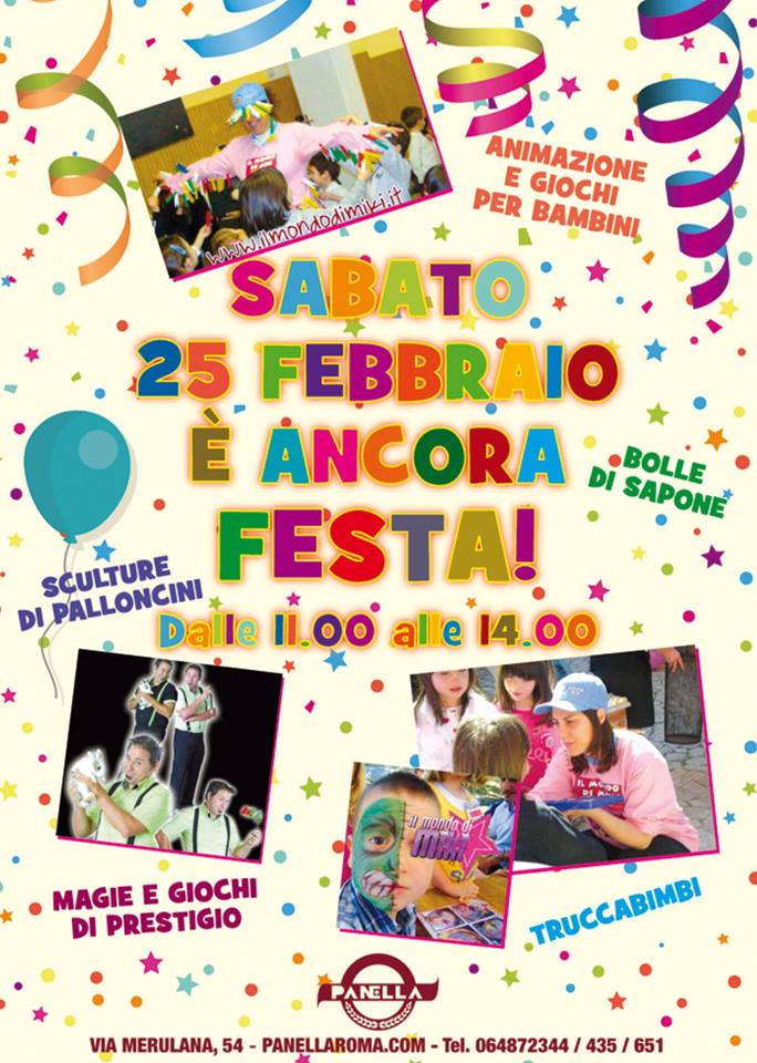 25 Febbraio, Sabato Grasso, alle ore 15.00 presso i giardini di Piazza Vittorio, ci sarà la festa di Carnevale per i bambini, a cura di Paola Morano