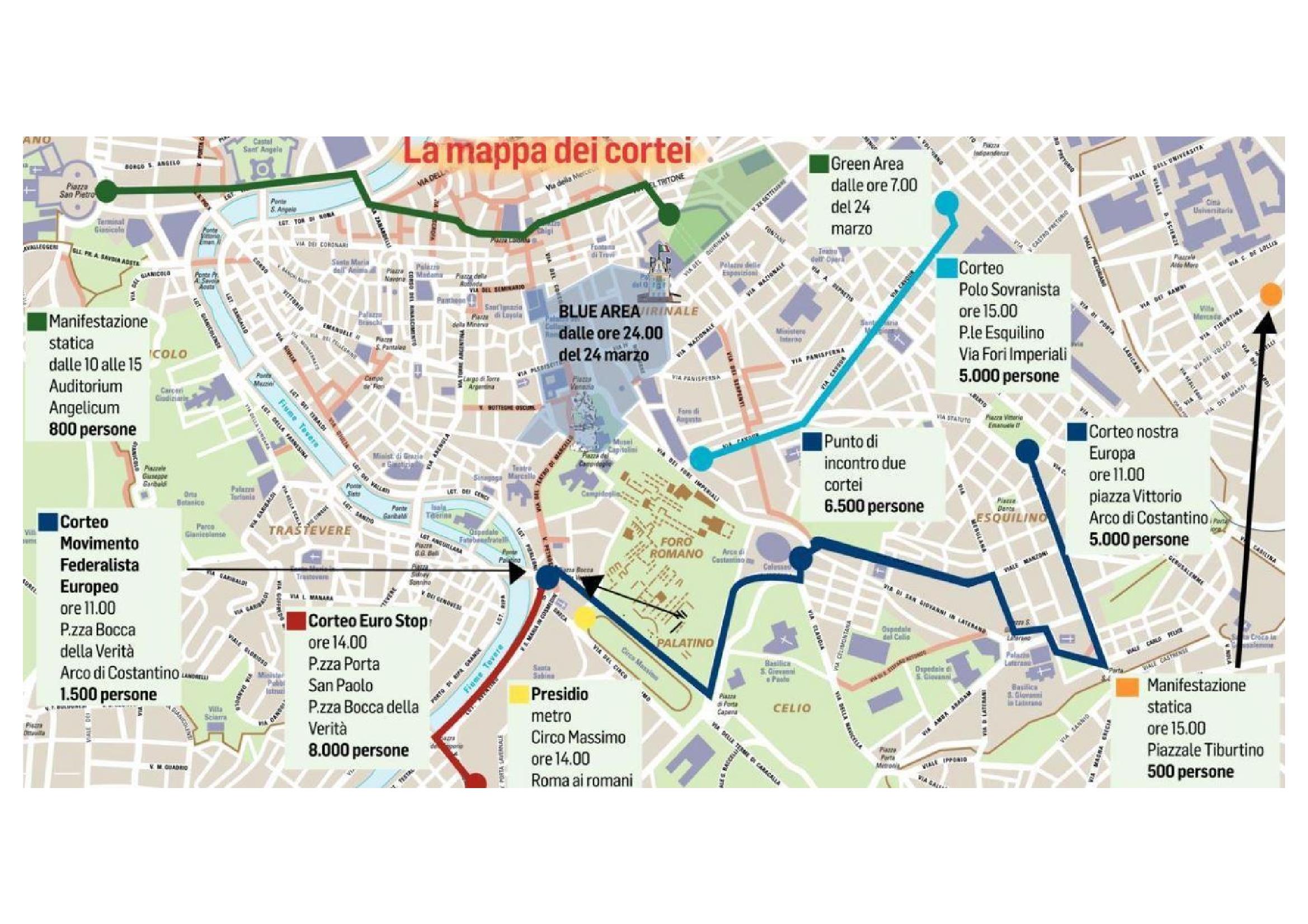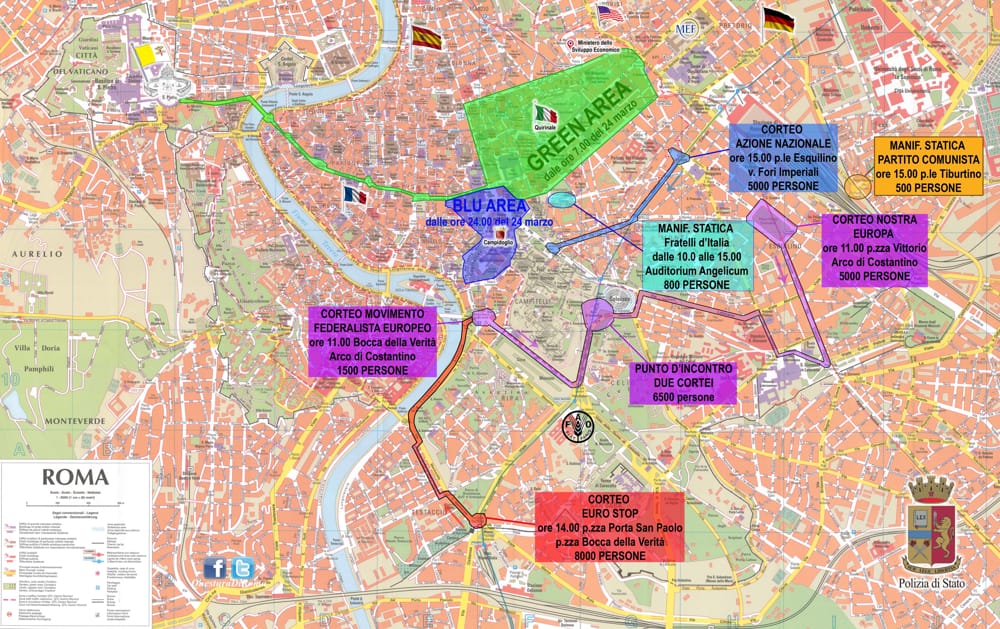 Sei le manifestazioni dispiegate in vari orari e in varie zone di Roma. Alle 11 i partecipanti del corteo del Movimento federalista europeo partiranno dalla Bocca della Verità per raggiungere il Colosseo. Alle 11 un altro corteo, quello di Nostra Europa, partirà da piazza Vittorio per arrivare all’Arco di Costantino. Nel pomeriggio le manifestazioni che destano più preoccupazione. Alle 14 il corteo EuroStop partirà da piazza porta San Paolo e attraverserà Testaccio, percorrendo via Marmorata, via Luca della Robbia e lungotevere Aventino e Bocca della Verità . Alle 15 partirà da piazza dell’Esquilino il corteo di Azione Nazionale che terminerà in via dei Fori Imperiali. In programma anche due manifestazioni statiche Fratelli d’Italia e partito Comunista.