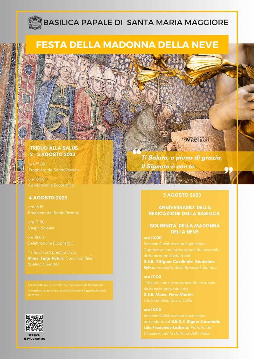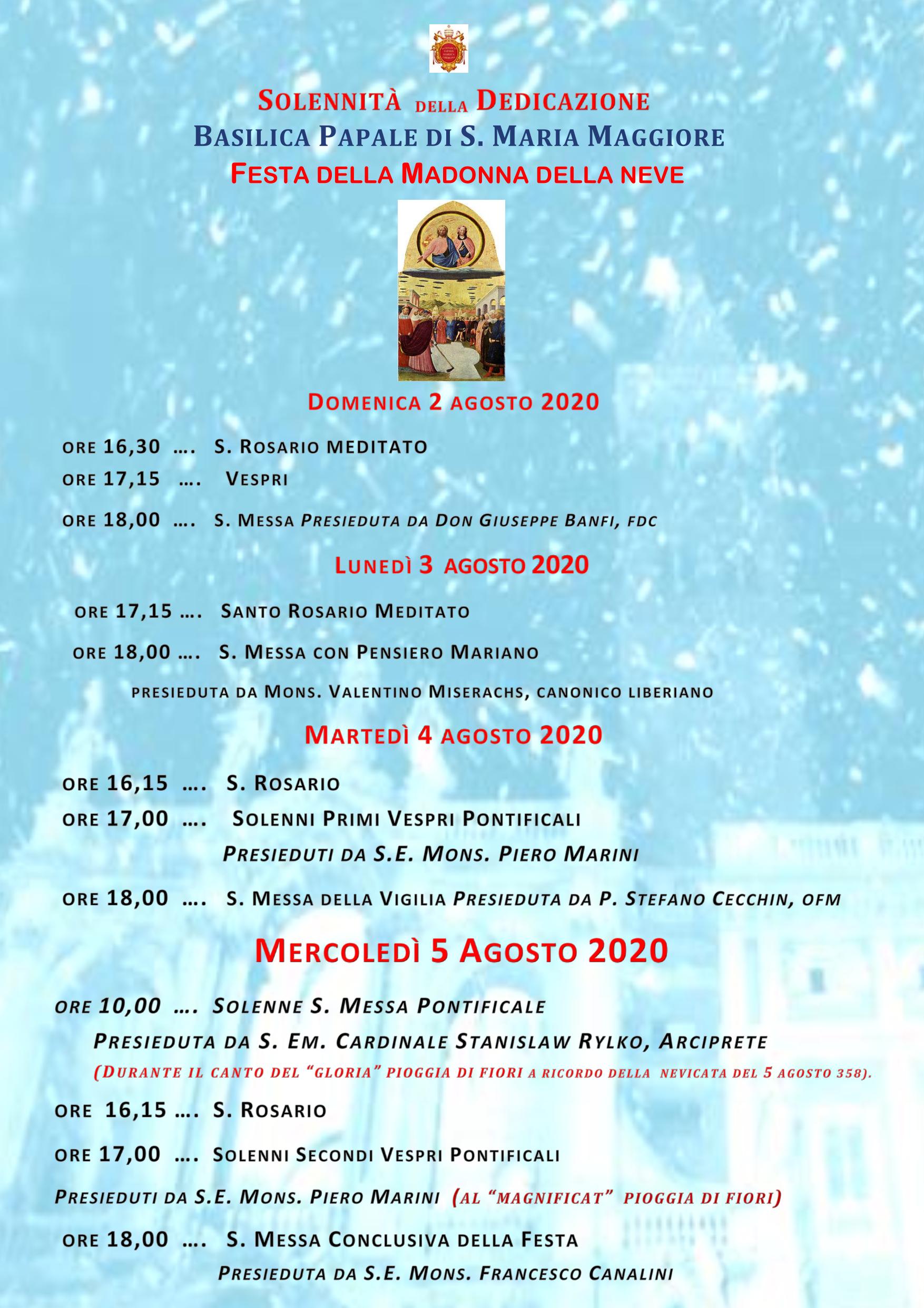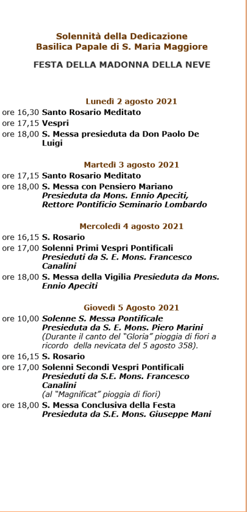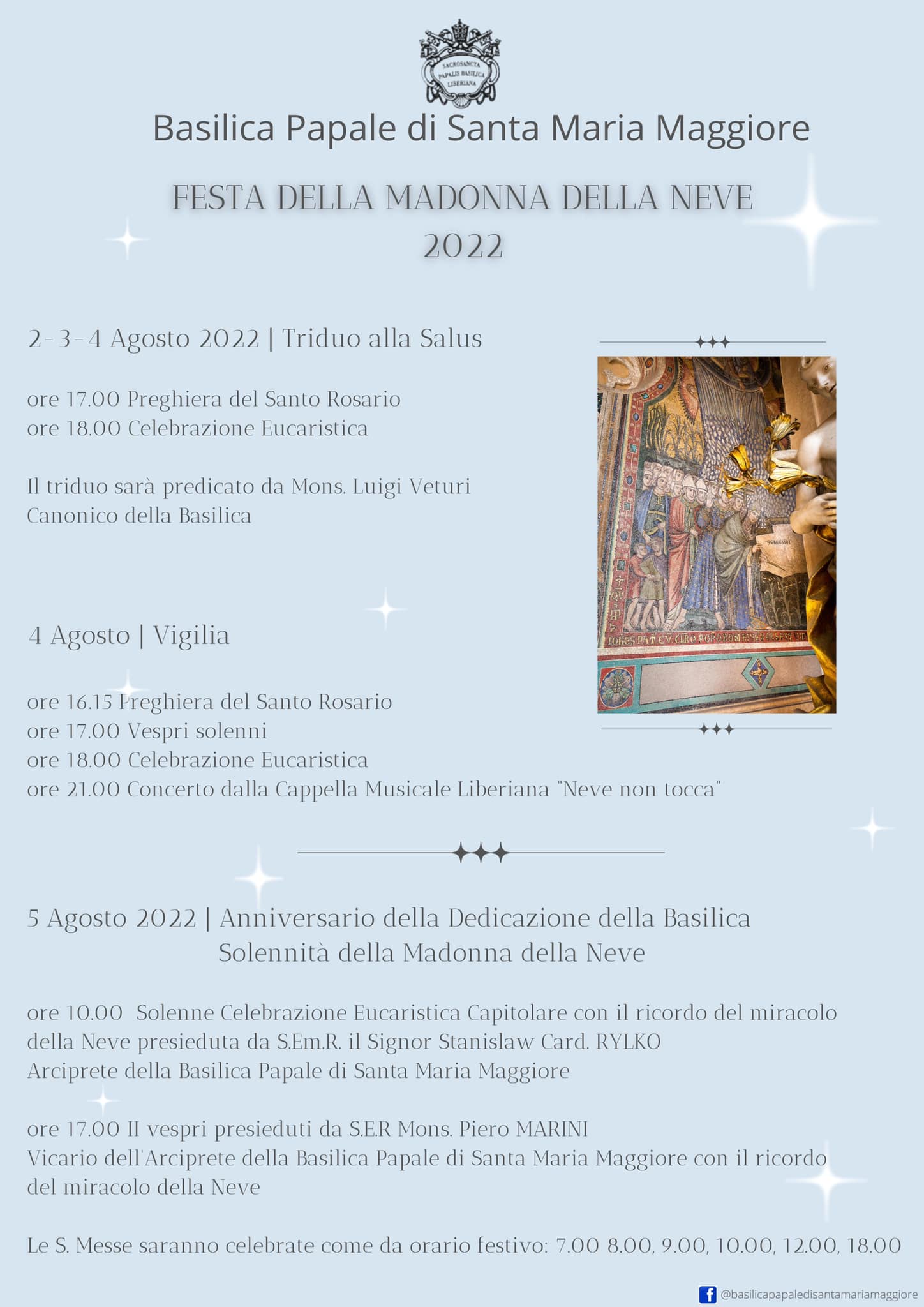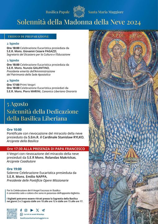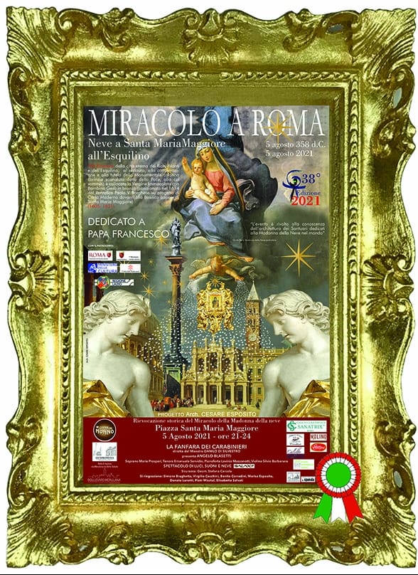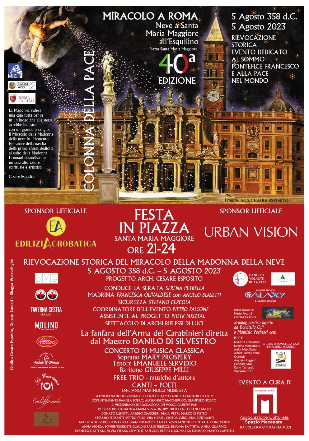 Dalle ore 21.00 alle ore 24.00, si svolge la rievocazione storica del “Miracolo della Madonna della Neve” in piazza di Santa Maria Maggiore. Per l’evento dalle ore 20.30 fino a fine servizio, chiuse al traffico piazza di Santa Maria Maggiore, via dellโ Esquilino, via Liberiana, via Carlo Alberto e via Merulana (da piazza di Santa Maria Maggiore a largo Brancaccio). Deviate le linee 16-70-71-360-590-649-714.