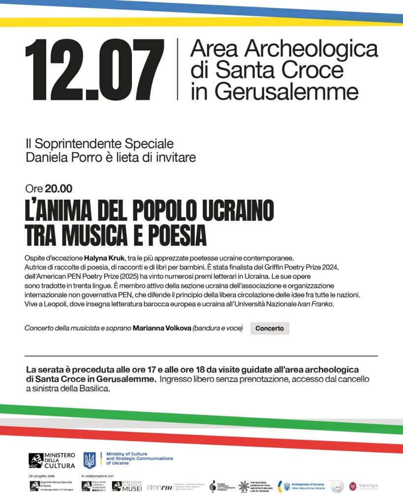 In occasione della Conferenza sulla Ripresa dell’Ucraina in programma a Roma, la Soprintendenza Speciale di Roma, in collaborazione con Direzione Generale Cinema e Audiovisivo e Pantheon e Castel Sant’Angelo – Direzione Musei nazionali della città di Roma – Museo Nazionale degli strumenti musicali e a Ucraina CreAttiva, con il supporto del Ministero della Cultura e delle Comunicazioni strategiche dell’Ucraina e dell’Ambasciata d’Ucraina in Italia, promuove dal 7 al 12 luglio 2025 un ciclo di iniziative dedicate alla conoscenza interculturale, al dialogo e alla pace.