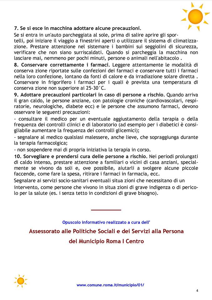 - Adottare precauzioni particolari se si è a rischio Quando arriva il gran caldo, le persone anziane, con patologie croniche (cardiovascolari, respiratorie, neurologiche, diabete ecc)e le persone che assumono farmaci, devono osservare le seguenti precauzioni: – consultare il medico per un eventuale aggiustamento della terapia o della frequenza dei controlli clinici e di laboratorio (ad esempio per i diabetici è consigliabile aumentare la frequenza dei controlli glicemici) – segnalare al medico qualsiasi malessere, anche lieve, che sopraggiunga durante la terapia farmacologica – non sospendere mai di propria iniziativa la terapia in corso.
