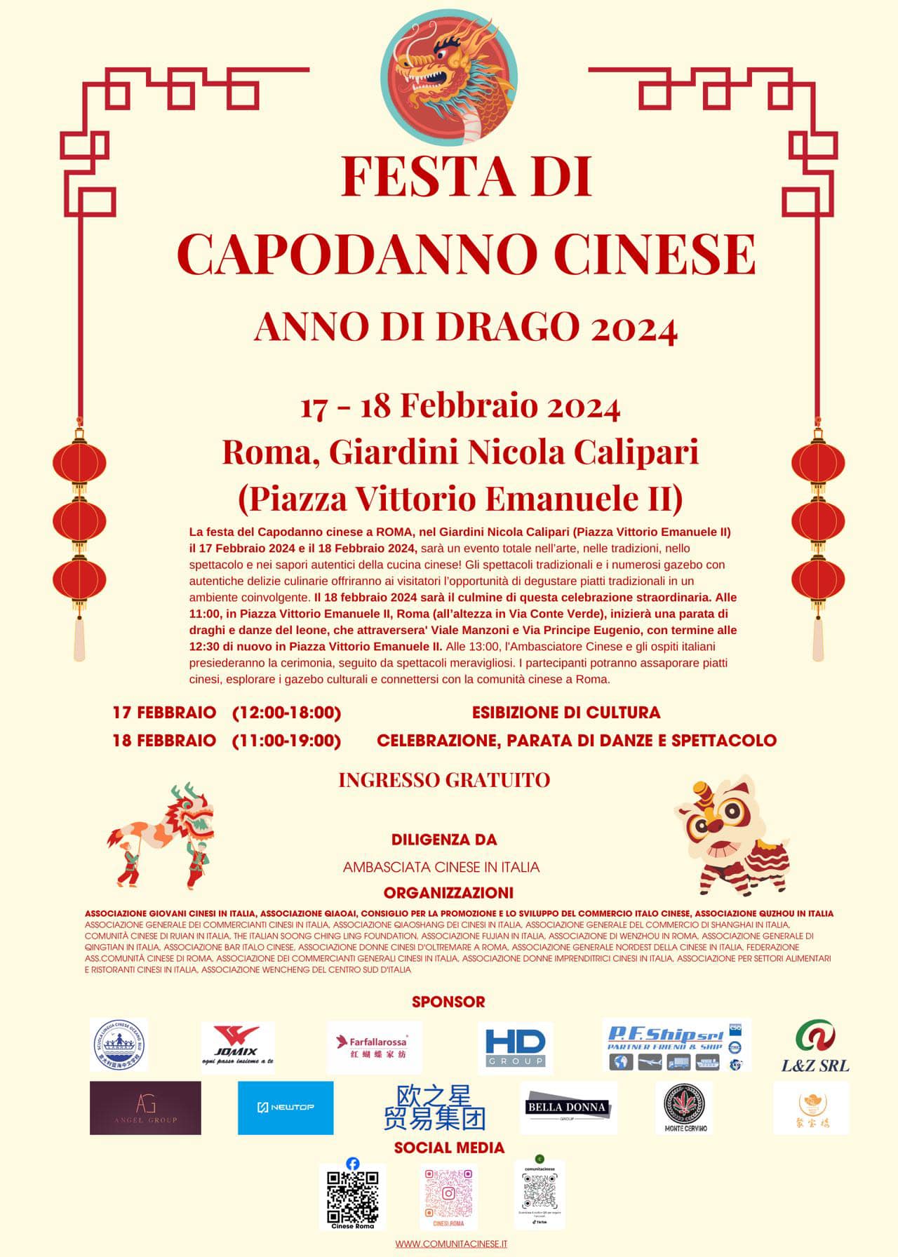 Il 9 febbraio invece segnerà l’apice di questa straordinaria celebrazione, con esibizioni culturali e culinarie previste dalle 9:00 alle 21:00. Alle 10:00, si inizia con una vivace parata di draghi e danze del leone. Alle ore 13:00, l’Ambasciatore Cinese e tutti gli ospiti italiani saranno presenti per l’inizio della cerimonia. Alle 14:00, si terranno i vari spettacoli del “Festival del Capodanno Cinese della Comunità Cinese con la magia di lanterne, uno spettacolare show di luci, divertenti giochi di indovinelli. Alle 15:00 si terrà la premiazione. I partecipanti avranno l’opportunità di gustare piatti cinesi, esplorare i gazebi dedicati alla cultura cinese e connettersi con la comunità cinese di Roma.