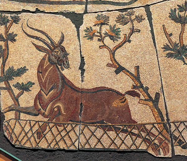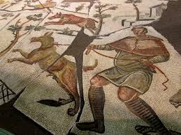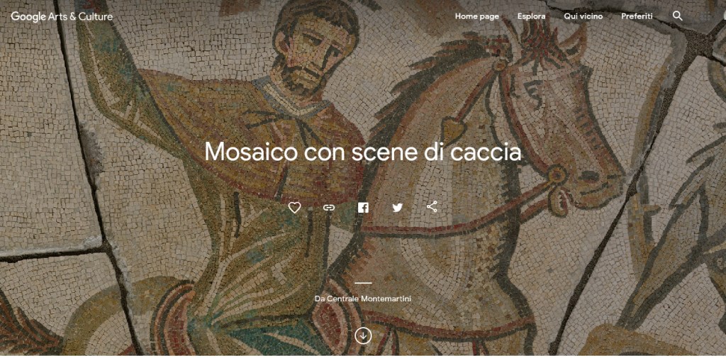 E’ un grandioso mosaico di età imperiale che si trova al centro della Sala Caldaie della Centrale Montemartini. Fu casualmente scoperto a Roma nel 1903 durante i lavori per la costruzione del sottopassaggio ferroviario presso la chiesa di Santa Bibiana, nel quartiere Esquilino. In 9 zoom, è possibile apprezzare la tecnica esecutiva, i materiali usati per le tessere, e dettagli delle scene di cattura di animali selvatici e dei cacciatori
