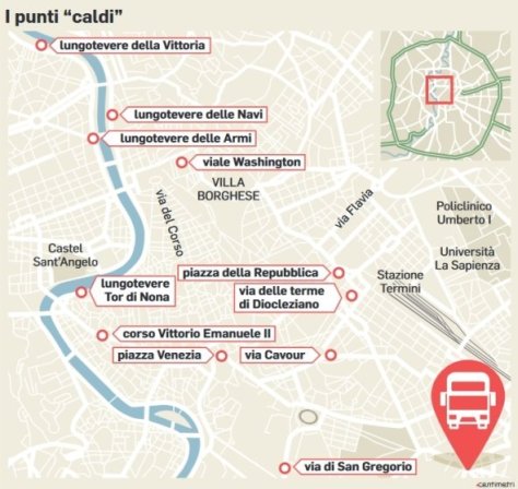 La nostra associazione ha presenziato mercoledì 3 ottobre scorso insieme a esponenti di altre associazioni e/o comitati del Centro Storico ad una riunione ristretta con il Presidente della Commissione Mobilità Sostenibile di Roma Capitale Dott. Enrico Stefàno proprio per discutere sulle criticità e sui modi di attuazione della Deliberazione dell’Assemblea Capitolina n.55 approvata il 15/05/2018 sul nuovo regolamento dei bus turistici che entrerà in vigore dal 1 gennaio 2019 (vedi). Purtroppo i fatti sono precipitati e il Comune ha deciso fin da ora di prendere delle decisioni per un controllo più severo in alcune zone a rischio (vedi pianta dei “punti caldi” tratta dal Messaggero e relativo articolo del 07/10/2018)