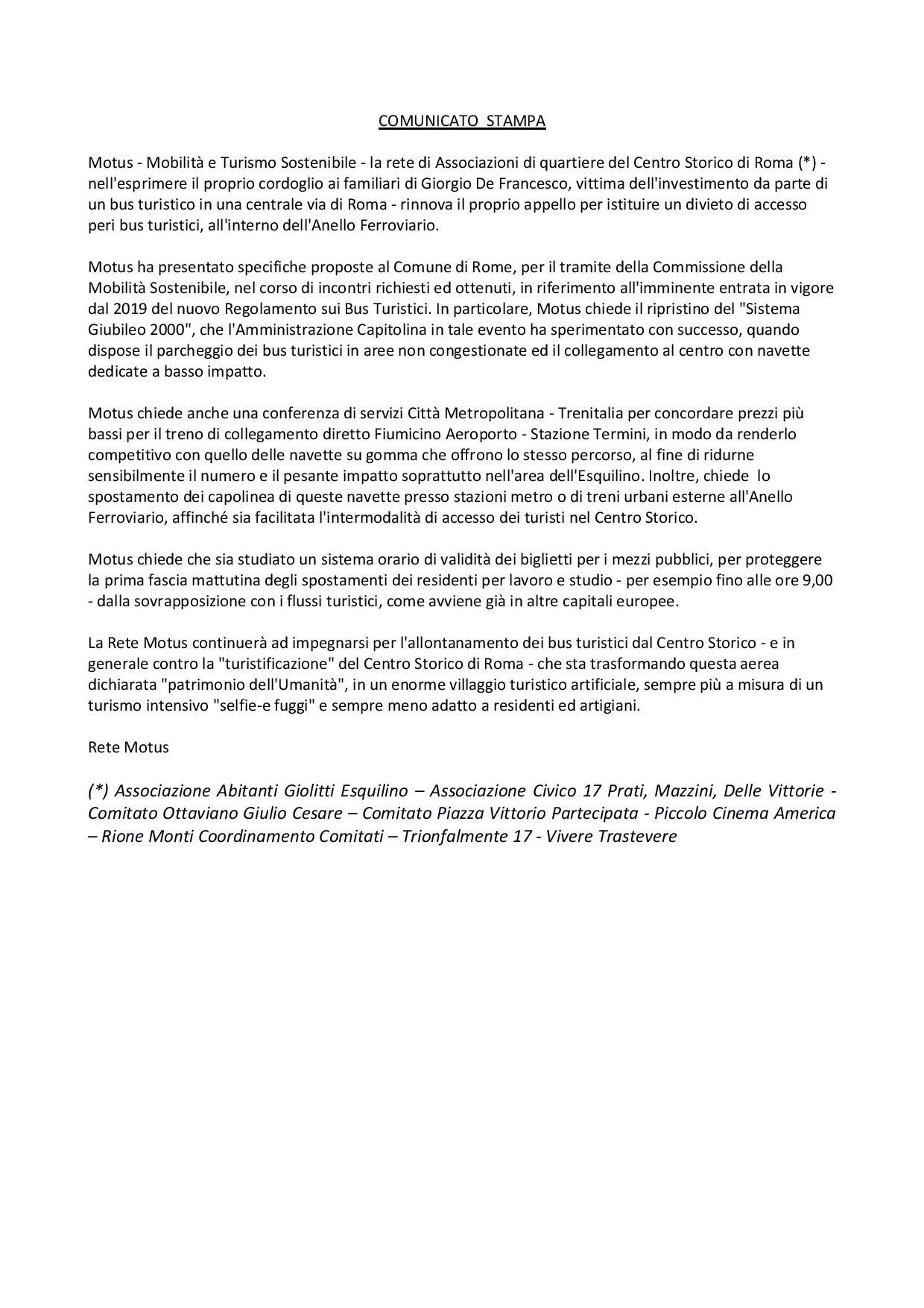 L’Associazione Abitanti via Giolitti Esquilino da tempo sta collaborando con la rete di Associazioni e Comitati del Centro Storico di Roma “Motus” nata per contrastare sia il fenomeno dell’invasione dei bus turistici nelle vie del centro della città, sia il problema del turismo “mordi e fuggi” che sta rovinando non solo la vivibilità di chi abita o lavora nelle zone di maggior pregio artistico, storico e monumentale di Roma ma anche diverse attività imprenditoriali che da questo fenomeno turistico ricavano solo problemi e non certo opportunità di crescita.