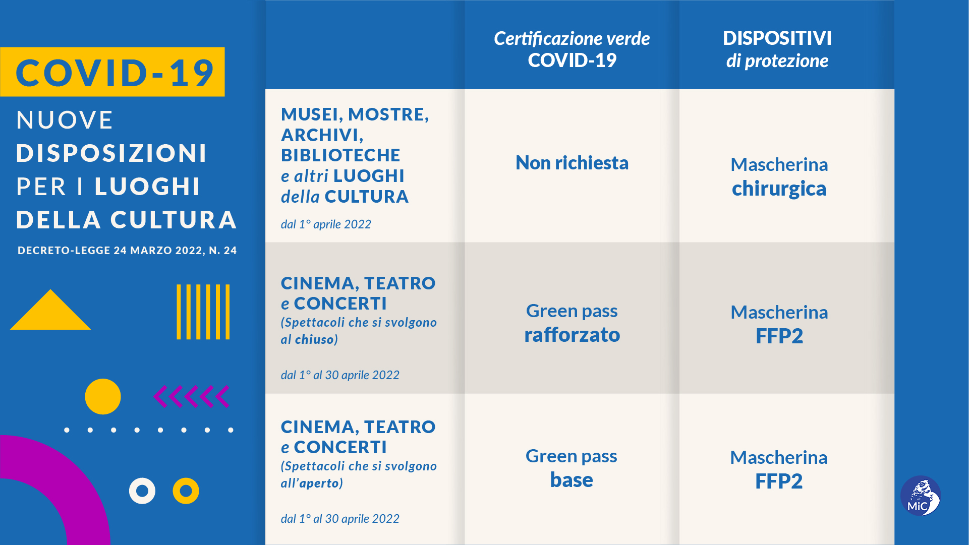 Dal 1 aprile 2022 diversi cambiamenti relativi alle norme per il contenimento del virus covid sars 2. Publichiamo le infografiche relative ai mezzi pubblici, ai luoghi della cultura e le nuove regole per la quarantena