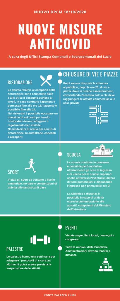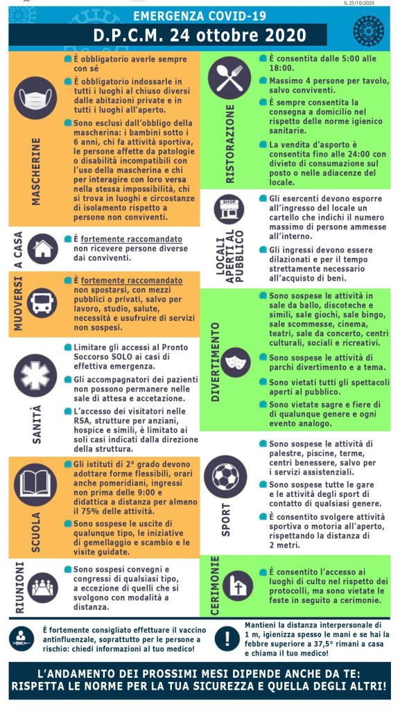 L’infografica riassume in maniera sintetica il Decreto del Presidente del Consiglio dei Ministri della Repubblica Italiana pubblicato il 18 ottobre 2020 relativo alle nuove norme per il contenimento del contagio del virus covid-19.