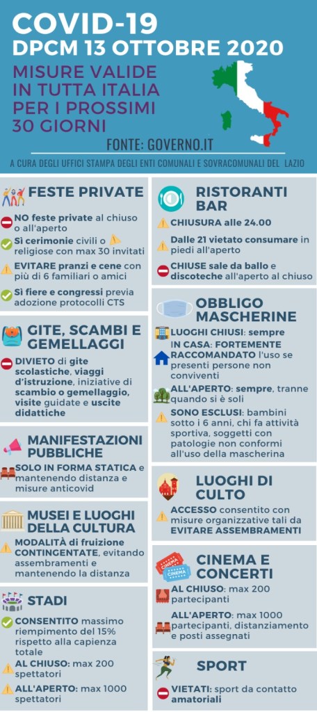 L’infografica riassume in maniera sintetica il Decreto del Presidente del Consiglio dei Ministri della Repubblica Italiana pubblicato il 13 ottobre 2020 relativo alle nuove norme per il contenimento del contagio del virus covid-19.
