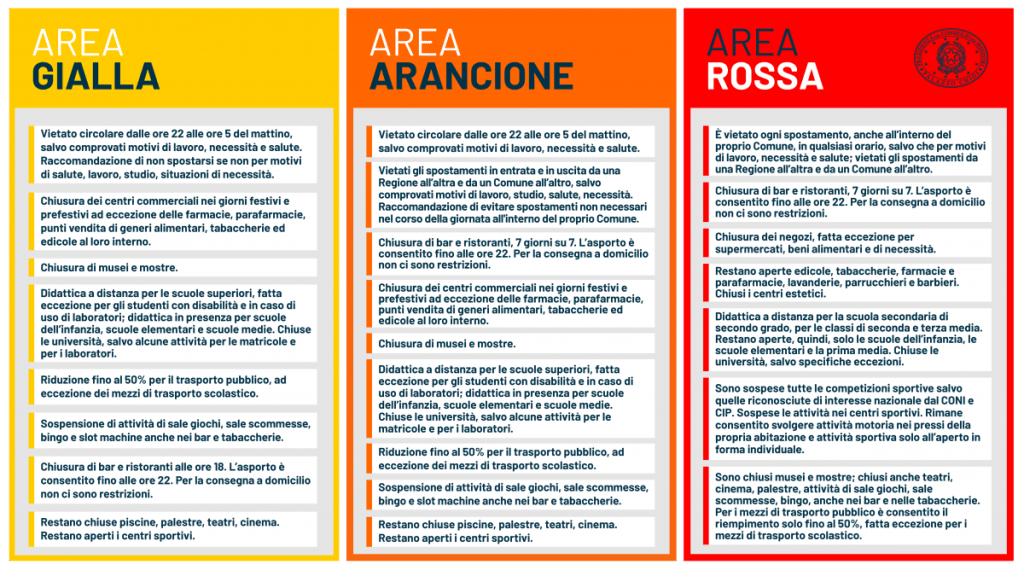Le infografiche riassumono in maniera sintetica il Decreto del Presidente del Consiglio dei Ministri della Repubblica Italiana pubblicato il 4 novembre 2020 relativo alle nuove norme per il contenimento del contagio del virus covid-19.