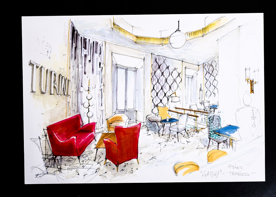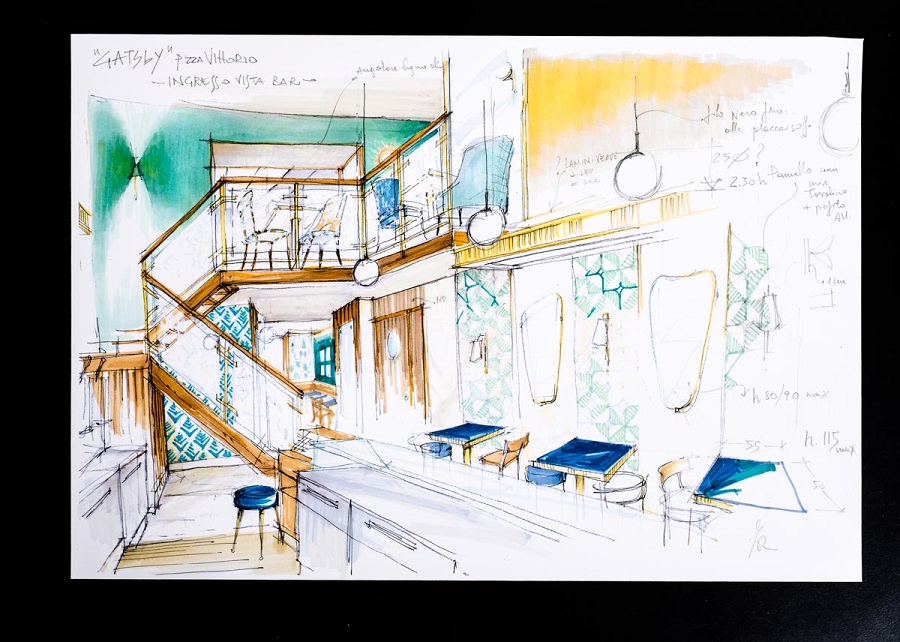 Oltrepassato lo show room del mezzanino, al primo piano sarà il salotto con terrazza a ospitare eventi, incontri e appuntamenti culturali che si prefiggono di regalare al Gatsby il calore e l’energia di un caffè letterario d’altri tempi, carta da parati alle pareti, musica soffusa (a disposizione c’è persino un pianoforte d’epoca). Ma la sorpresa potrebbe arrivare dai piani (ancora più) alti, nascosta sulla terrazza all’ultimo piano dello stabile, con splendida vista sulla città. Fuori, sotto al portico, nessuna insegna, ma solo la traccia dell’insegna che fu. Perché la memoria del passato è il segreto per avere successo nel presente. O almeno questo è l’auspicio dei ragazzi.