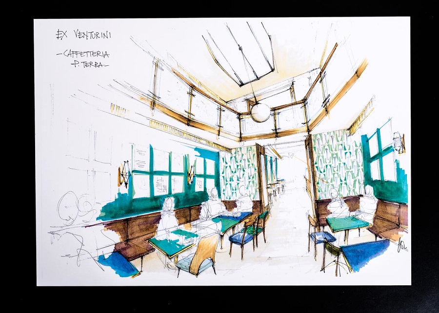Le vetrine del pian terreno, invece, hanno lasciato il posto al bancone del bar, impreziosito dall’infilata di sfere luminose che scendono dal soffitto; fanno da contraltare, in questo primo spazio che accoglie i clienti, tavolini blu e sedute in stile che conducono verso la sala adibita al servizio. Alla “messa in scena”, coordinate dall’architetto (e socio dell’attività) Fabio Lippa, hanno contribuito due brave scenografe – Federica Russo e Michela Rosa – che l’omaggio al passato l’hanno studiato come sottile fil rouge evocativo, muovendosi tra il recupero filologico di elementi d’epoca – dal restauro dell’acciaio anodizzato al riuso delle basi dei manichini (oggi parte integrante dei tavolini), al coup de théatre del primo piano, con l’insegna originale del cappellificio a illuminare l’ambiente – e la progettazione di scenografie in stile, da fare invidia a un set cinematografico. Ma cosa succederà adesso (si parte tra qualche giorno, lunedì 14 novembre) al civico 106 di piazza Vittorio? Luca della Valle, fotografo, è uno dei cinque soci che hanno scommesso sulla riqualificazione di uno spazio altrimenti destinato a morire per cessata attività, fondato agli inizi del Novecento e poi dagli anni Cinquanta rimasto immutato fino ai giorni d’oggi.