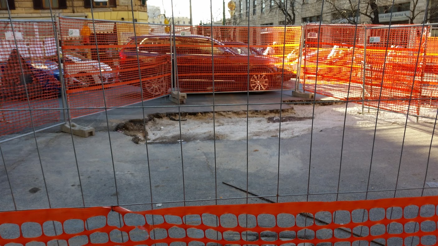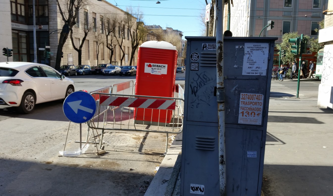 Non bastasse il fatto che i lavori Italgas a viale Manzoni siano stati pianificati nei periodi peggiori dell’anno per quanto riguarda il traffico, dimenticando che questa strada è una delle più trafficate dell’intero centro Storico di Roma, nonostante le opere di scavo e di sostituzione dei tubi fossero terminate , quasi tutte le buche richiuse e il cartello indicasse come il 3 di marzo il termine dei lavori (foto 3), è rimasto da asfaltare l’ultimo tratto fino al 9 marzo (foto 1) , sicuramente quello più invasivo ed anche pericoloso per veicoli e pedoni chissà per quale motivo (foto 2). Non sono stati ritrovati reperti archeologici (o se lo sono stati è stato fatto finta di niente), c’erano i mezzi per asfaltare la strada per gli altri tratti, rimane veramente un mistero perchè sia stato lasciato da fare questo piccolo tratto di strada all’incrocio con via Principe Eugenio (foto 4). Solo il 10 di marzo finalmente si è provveduto a finire il lavoro e togliere di mezzo le reti arancioni e liberare la strada ma lasciando il WC chimico (foto 5). Poco male, anzi sarebbe una buona idea per evitare che troppe persone utilizzino secchioni, muri e alberi per espletare i loro bisogni fisiologici.
