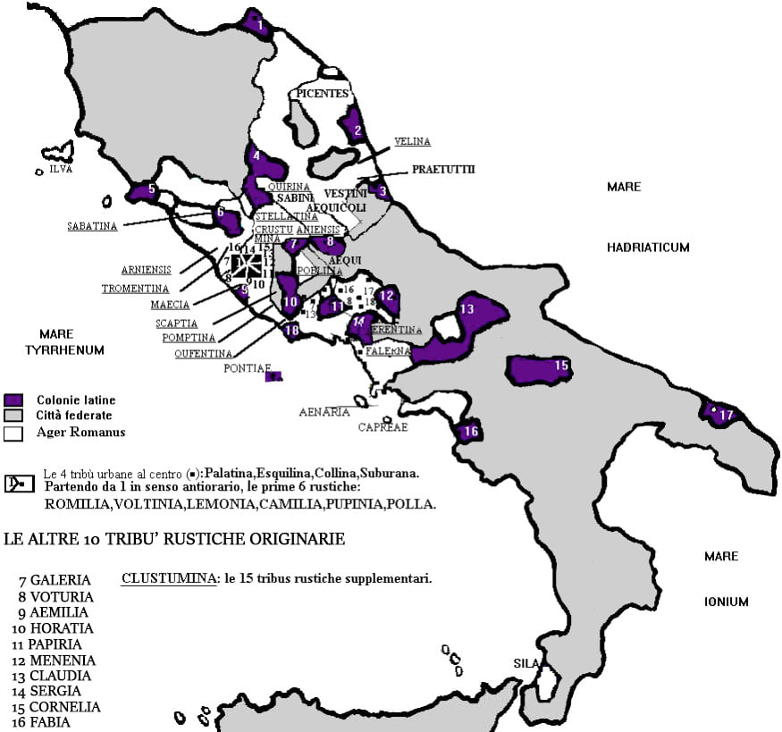 TRIBU’ URBANEIstituite da Servio Tullio. Da non confondere con le gentilizie di Romolo (Ramnes, Tities e Luceres)– Collina (comprendeva il colle Quirinale)– Esquilina (comprendeva il colle Esquilino)– Palatina (comprendeva il colle Palatino)– Suburana (comprendeva il colle Celio)TRIBU’ RURALI Anche queste 31 tribù territoriali e non gentilizie.Aniense 299-298 a.c. -l’area, costituita dopo la sottomissione degli Equi, e traversata dal fiume Anio (Aniene) da cui prende il nome la tribù, nel 304 a.c., posta attorno alle località di: Affile, Ficulea, Trebula Suffenas e Trevi nel Lazio, e a località della Gallia Cisalpina: Ariminum, Cremona e Vercelli.In contrada S. Angelo, sulla sinistra della strada Statale Sublacense, venendo verso Subiaco, si nota un arco tutto sesto su cui è collocato un piccolo sarcofago di epoca repubblicana, che reca incise le porole:“L. Maenius Q. F. Ani sepultus = Lucius Quinti filius Aniensi (tribu) sepultus”, è il sepolcro di un certo Lucio Menio che apparteneva alla Tribù Aniensi, gruppo etnico latino insediato stabilmente dai consoli nella Valle dell’Aniene, dopo che i Romani nel 299 a.c. avevano sottomesso gli Equi.Arniensis nel 387 a.c. -creata nel territorio della città etrusca di Veio, attorno alle città di: Cluviae, Blera, Caere, Chiusi, Forum Clodii, Histonium, Juvanum nel Sannio, Ocriculum, Teate Marrucinorum,Clustumina o Crustumina 495 a.c. oppure 449 a.c. -fu creata in seguito alla conquista di Crustumerio. Si conserva un’iscrizione del pontifex C. Caesidius C.f. Cru. Dexter (C.I.L. XI 6033), della tribù Clustumina.Falerna o Falerina 318 a.c. -con centro a Capua e nell’area a destra del fiume Volturno. Questi territori dell’agro Falerno, sottratto ai Volsci, passarono a Roma e dove in seguito sorse la colonia latina di Cales.Horatia almeno dal 495 a.c. -antichissima famiglia patrizia romana, di origine autoctona. Va certamente ricompresa tra le cento gentes originarie ricordate dallo storico Tito Livio.Lemonia VI o inizi del V secolo a.c. -denominata dal pagus Lemonius, non sopravvisse la corrispondente gens originaria dopo il IV secolo a.c.Maecia 332 a.c. -creata nella pianura Pontina, dal territorio sottratto ai Volsci, comprendente anche città come Lanuvio, Napoli, Hatria e Libarna.Oufentina o Ufentina 318 a.c. -creata lungo la via Appia tra Terracina e Priverno, dal territorio sottratto ai Volsci. Si conserva un’iscrizione Oufentina per il quattuorviro C. Planius C.f. Of. Priscus (Ann. épigr. 1959, 94).Popillia o Poblilia 357 a.c. -creata con i territori sottratti ai Volsci.Pollia almeno dal 495 a.c. -non sopravvisse la corrispondente gens originaria dopo il IV secolo a.c.. P. Plotius L.f. Cam. veterano della II legione Augusta fu sepolto a Fanum Fortunae (della tribù Pollia) in un bel monumento ‘a tamburo’ di prima età imperiale (C.I.L. XI 6223) con la liberta Urbana.Pomptina 358-357 a.c. -creata nella pianura Pontina, con i territori dei Volsci e comprendente le città di Norba, Circeii, Ulubrae e Bovillae.Pupinia almeno dal 495 a.c. -non sopravvisse la corrispondente gens originaria dopo il IV secolo a.c.; sembra però che durante l’incursione di Annibale verso Roma, il condottiero cartaginese da Gabii passò per la regione Pupinia e pose il campo ad 8 miglia da Roma.Quirina 241 a.c. -creata sul territorio dei Pretuziani e nel Piceno, lungo la via Salaria con centro principale in Rieti.Sabatina 387 a.c. -creata attorno a Veio fino ai monti Cimini, estesa più tardi alla città di Mantua (Mantova).Scaptia 332 a.c. -creata nella pianura Pontina, dal territorio sottratto ai Volsci, comprendente la città di Velletri.Sergia almeno dal 495 a.c. -vi furono inserite le popolazioni ribelli dei Marsi e dei peligni, sopravvisse fino ad oltre il IV secolo a.c..Stellatina 387 a.c. -fu creata nel territorio della città etrusca di Veio, sulla destra del Tevere nella zona di Capena, estesa più tardi alla città di Forum Livii (oggi Forlì), patria di Cornelio Gallo, ed alle circostanti Mevaniola (Galeata) e Forum Popilii (Forlimpopoli).Teretina 299 a.c. -creata lungo la via Appia, a nord del Volturno, sul territorio preso ai Sabini intorno all’odierna Frosinone.Tromentina 387 a.c. -creata nel territorio della città etrusca di Veio, a nord della tribù Fabia.Velina 241 a.c. -fu creata sul territorio dei Pretuziani e nel Piceno, con centro nelle colonie di Interamna e Castrum novum, lungo la costa adriatica a nord del fiume Aterno, e dall’89 a.c. con Aquileia.Voltina o Voltinia almeno dal 495 a.c. -non sopravvisse la corrispondente gens originaria dopo il IV secolo a.c.Veturia o Voturia costituita almeno dal 495 a.c. sopravvisse fino ad oltre il IV secolo a.c. Ne faceva parte la città di Bergamo.Camilia –Claudia –Cornelia–Emilia–Fabia–Menenia–Papiria—Romilia–Valeria–Voltina queste altre tribù -almeno dal 495 a.c. -sopravvissero fino ad oltre il IV secolo a.c. non si hanno notizie più approfondite
