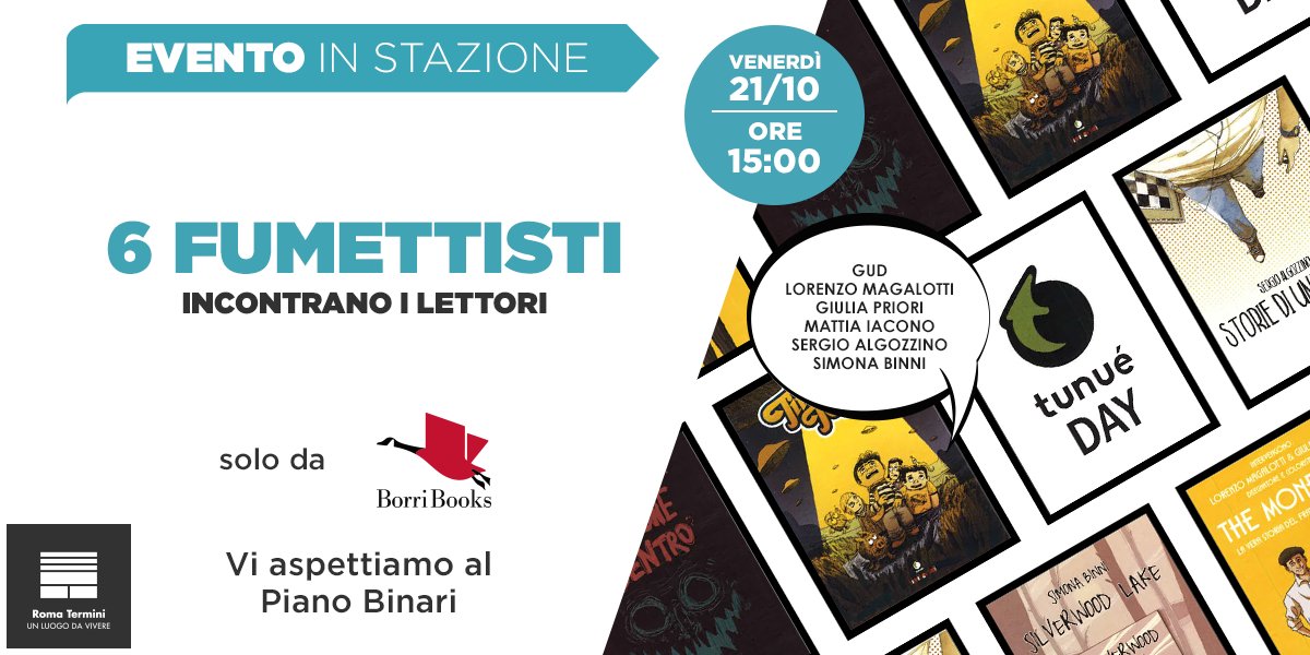 Tanti stili per un unico evento dedicato all’arte di disegnare storie. GUD, Lorenzo Malagotti, Giulia Priori, Mattia Iacono, Sergio Algozzino e Simona Binni sono gli autori che incontreranno i lettori e firmeranno le copie dei loro libri venerdì 21 ottobre alle libreria Borri Books. Ti aspettiamo alle 15.00 al Piano Binari!