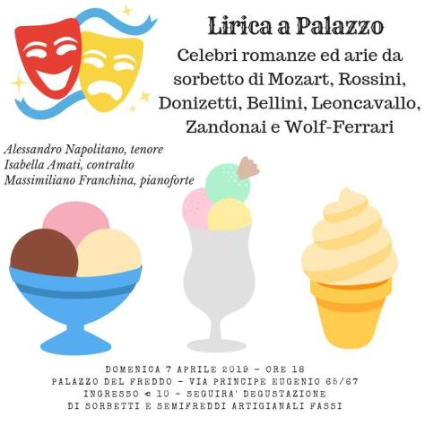 Una bellissima occasione per far conoscere al pubblico del Palazzo del Freddo l’antica tradizione delle “arie da sorbetto”, momenti che gli autori inserivano verso la fine dello spettacolo, affidati ad uno dei comprimari e che toccavano solo marginalmente la trama dell’opera stessa. A differenza di quanto accade oggi, il pubblico dei teatri d’opera del XIX° secolo raramente ascoltava in silenzio l’esecuzione, preferendo invece conversare ma soprattutto bere e mangiare ciò che si cucinava negli stessi palchi, per non parlare poi delle coppe di gelato preparate nei foyer teatrali da esperti mastri gelatieri. Spesso i gelatieri rimanevano con parte della merce invenduta, ragion per cui gli impresari iniziarono sempre più spesso a richiedere ai compositori (in particolare a Gioacchino Rossini) di inserire nelle partiture “arie da sorbetto” che, affidate ai personaggi meno importanti dell’opera ed in cui non si verificava alcun evento rilevante per la vicenda, avrebbero consentito ai venditori di smaltire la merce, al pubblico di godersi un attimo di relax ma soprattutto agli impresari di intascare ricche percentuali sulle vendite dei gelati!