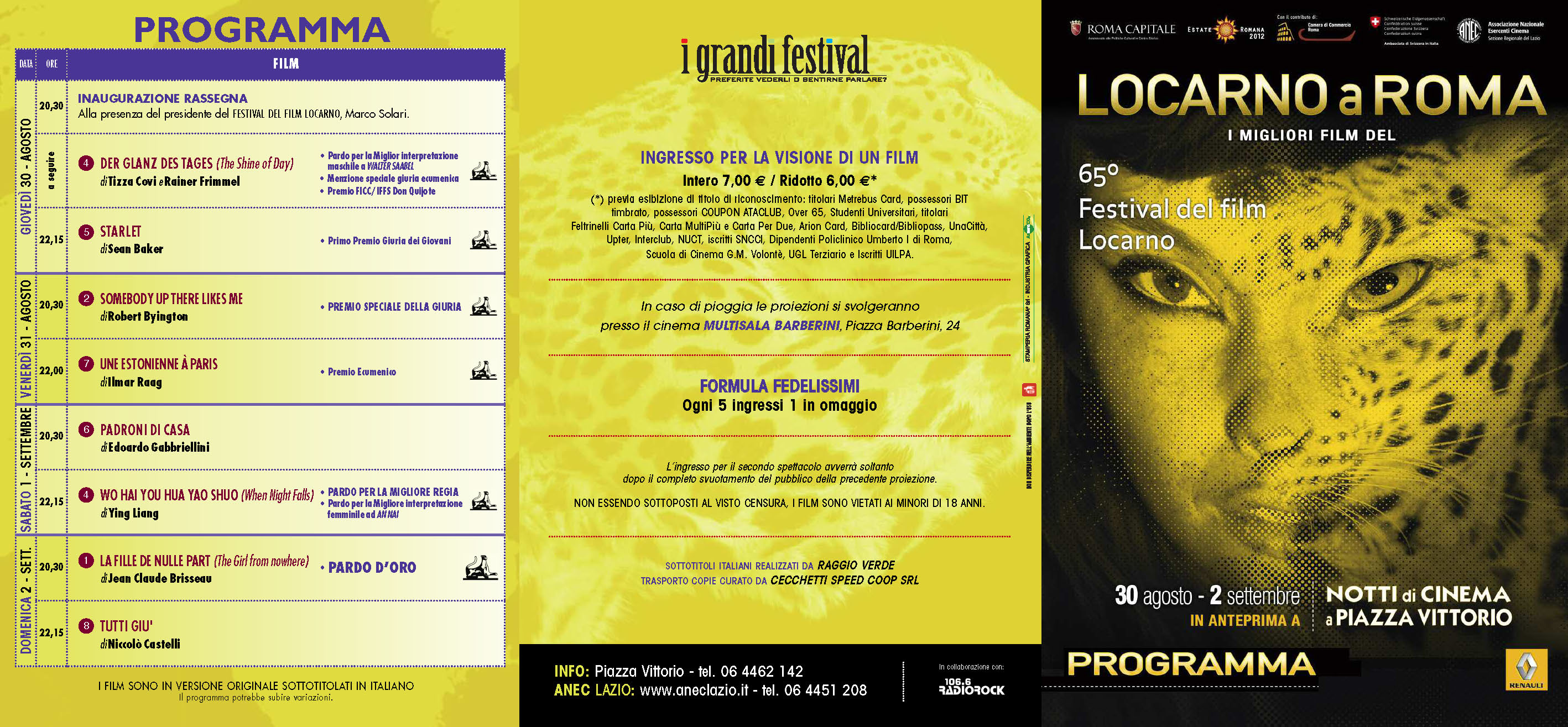 Dal 30 agosto al 2 settembre la rassegna “Notti di cinema a Piazza Vittorio” ospiterà la XI edizione di “Locarno a Roma” che presenta una selezione di 8 films tra quelli che hanno partecipato alla manifestazione nella città svizzera. In caso di pioggia le proiezioni saranno spostate nella multisala Barberini.
