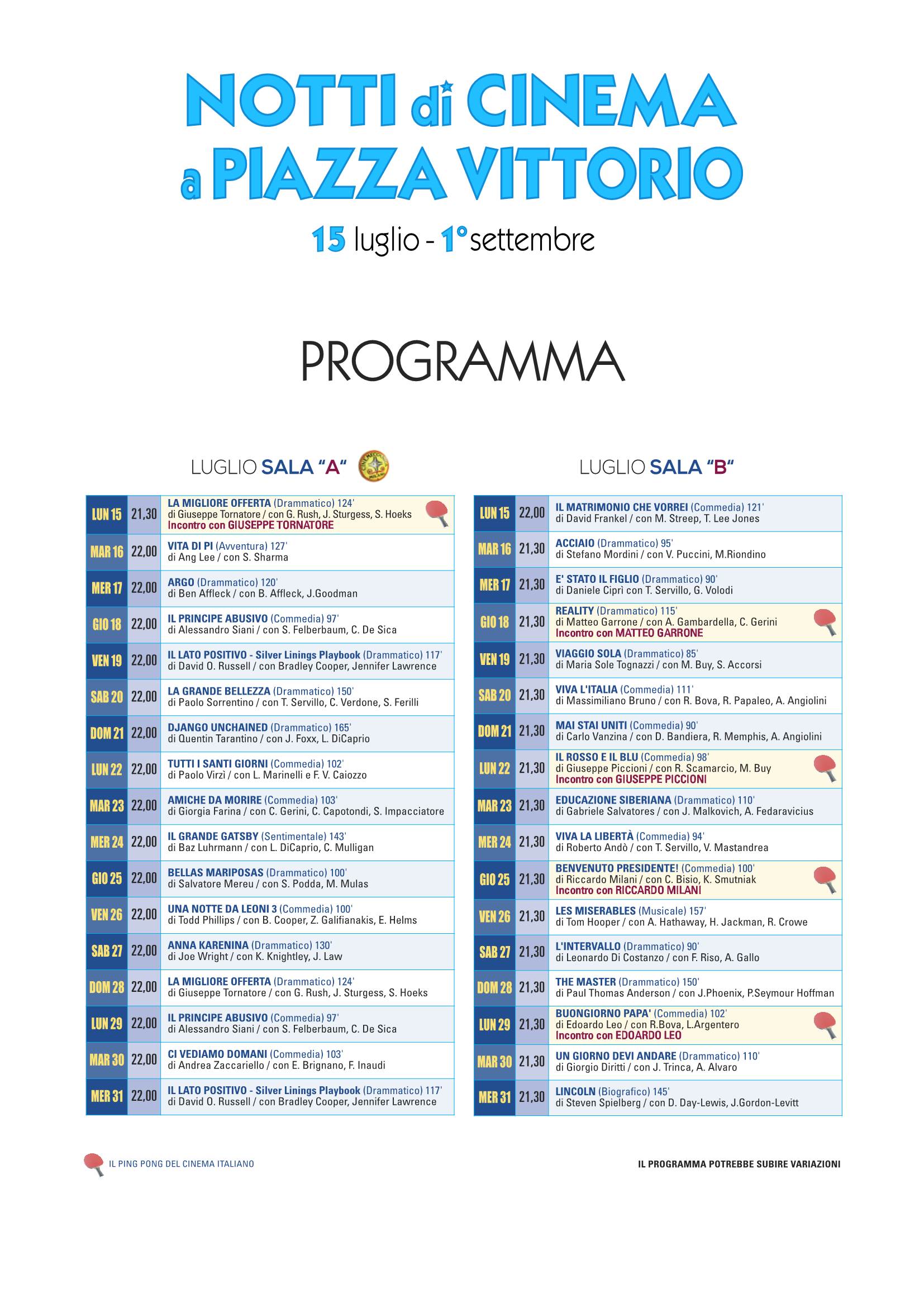 Anche quest’anno a Piazza Vittorio verranno allestiti due maxischermi per la proiezione dei titoli di maggior successo della stagione cinematografica appena conclusa. Saranno organizzati come di consueto i soliti incontri con registi e attori di richiamo grazie al PING PONG DEL CINEMA ITALIANO.
