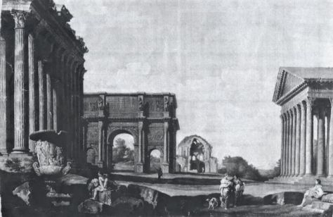 In quest’altro dipinto (immagine in bianco e nero) il monumento è inserito in un ulteriore ambiente inventato