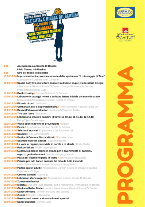 Anche quest’anno ci saranno tantissimi eventi! Il torneo di minibasket prima di tutto, ma anche calcetto, kung fu, danze popolari, musica, pesca per i bimbi con tanti regali, asta delle bici, laboratori, karaoke, il baratto dei libri… e altro ancora!