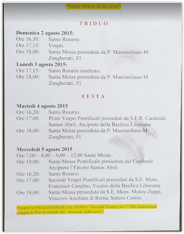 Screen Shot 08-02-15 at 05.34 PMVogliamo ricordare anche l’ importanza religiosa che questa data riveste per il rione Esquilino. Nei giorni e nelle ore precedenti alla rievocazione storica saranno officiate diverse funzioni all’interno della Basilica. Da segnalare le Messe Solenni delle ore 10,00 e delle ore 17,00 del 5 agosto duranti le quali si ci sarà la pioggia dei petali bianchi per ricordare il miracolo del 352 d.C.