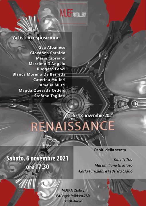 REINASSANCE.Il titolo che è stato dato a questa iniziativa gioca sul doppio significato che il termine francese RENAISSANCE assume sia nel senso di “rinascita” che di “Rinascimento”, e che perciò vuole per noi indicare il desiderio che questo presente ancora problematico si riveli per tutti noi un momento di costruttivo e ottimistico slancio al futuro e al tempo stesso segni un’auspicabile punto di svolta nell’apprezzamento delle arti e della bellezza.Artisti partecipanti:Gea Albanese, Giovanna Cataldo, Maria Cipriano, Massimo D’Angelo, Ruggero Lenci, Blanca Moreno De Barreda, Caterina Mulieri, Amelia Mutti, Magda Quesada Ordeig, Stefano Tagliati.