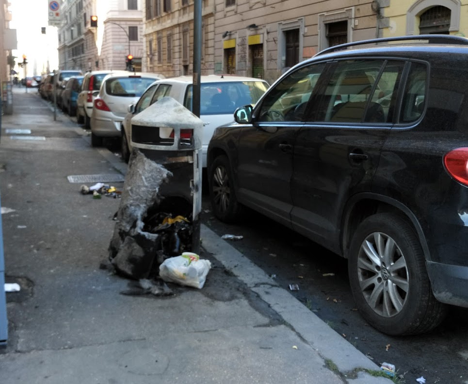 Non vorremmo che questo problema dei roghi all’Esquilino non fosse solo di natura accidentale (un mozzicone di sigaretta acceso può causare questo disastro) perchè in una ventina di giorni è il secondo episodio del genere che succede praticamente a pochi metri l’uno dall’altro. Ecco come era ridotto uno dei pochi cestini rimasti nel rione dopo un altro rogo avvenuto all’incrocio tra via Bixio e via Giolitti anche qui con l’intervento dei Vigili del Fuoco.