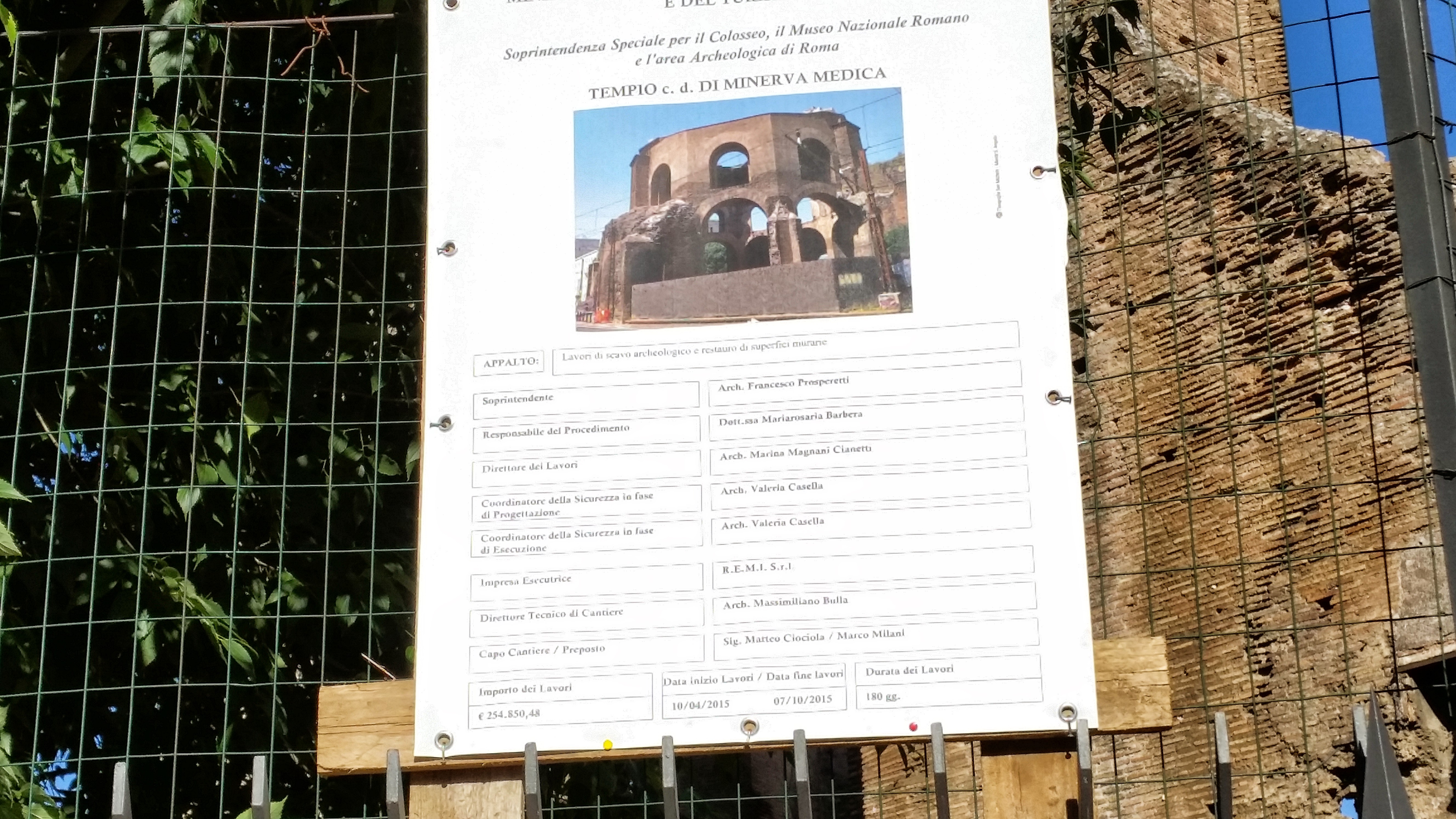La mattina del 28/05/2015 è stato cambiato il cartello all’entrata del cantiere per i lavori di restauro del Ninfeo degli Horti Liciniani meglio conosciuto come Tempio di Minerva Medica a via Giolitti. Credevamo che fosse finalmente la notizia della fine del cantiere e magari una data per la riapertura del monumento, in realtà si tratta di un ulteriore lotto per lavori di “scavo e restauro di superfici murarie” con una fine fissata al 7/10/15.