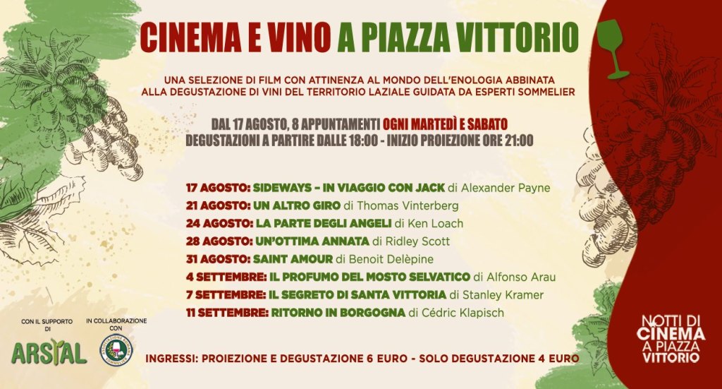 Si tratta della proiezione di film con attinenza al mondo dell’enologia abbinata alla degustazione di vini del territorio laziale guidata da esperti sommelier