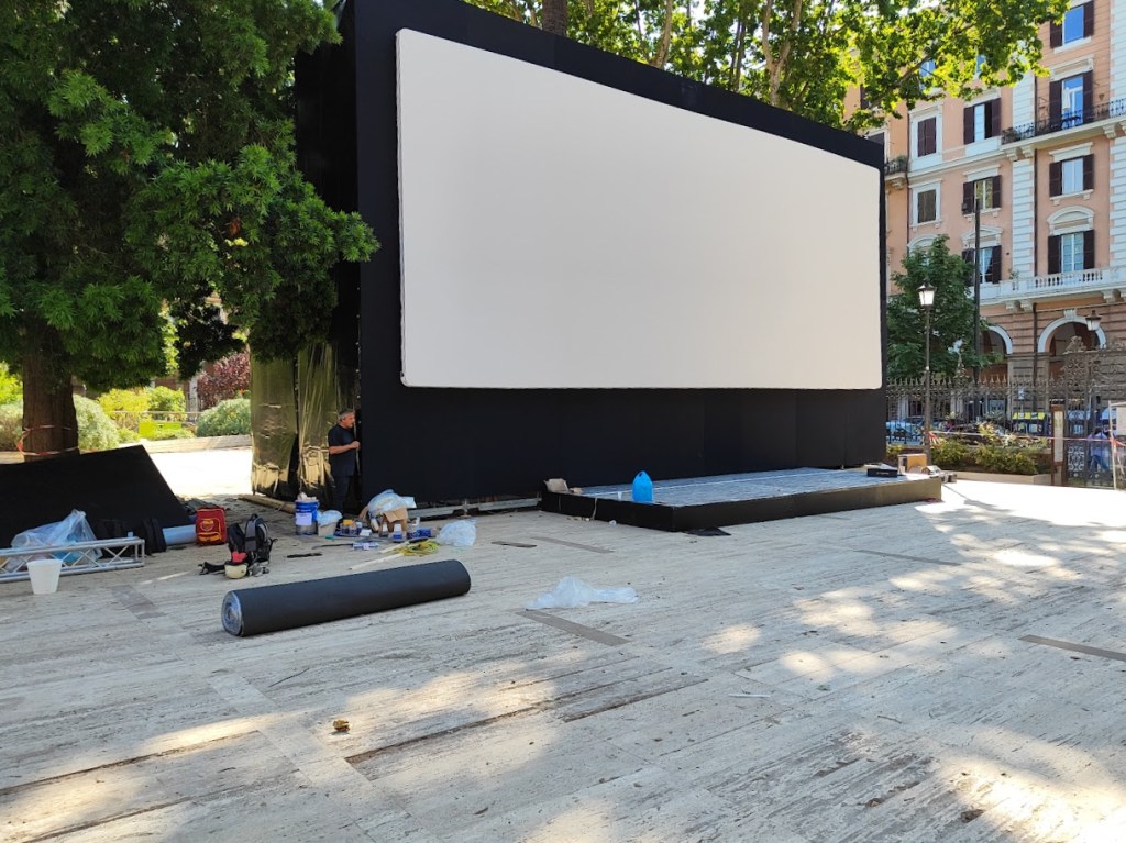 Ultimi preparativi al CineVillage Piazza Vittorio per l’edizione 2023 di “Notti di Cinema Apiazza Vittorio” che avrà luogo nel giardino della piazza dal 23 giugno al 16 settembre.