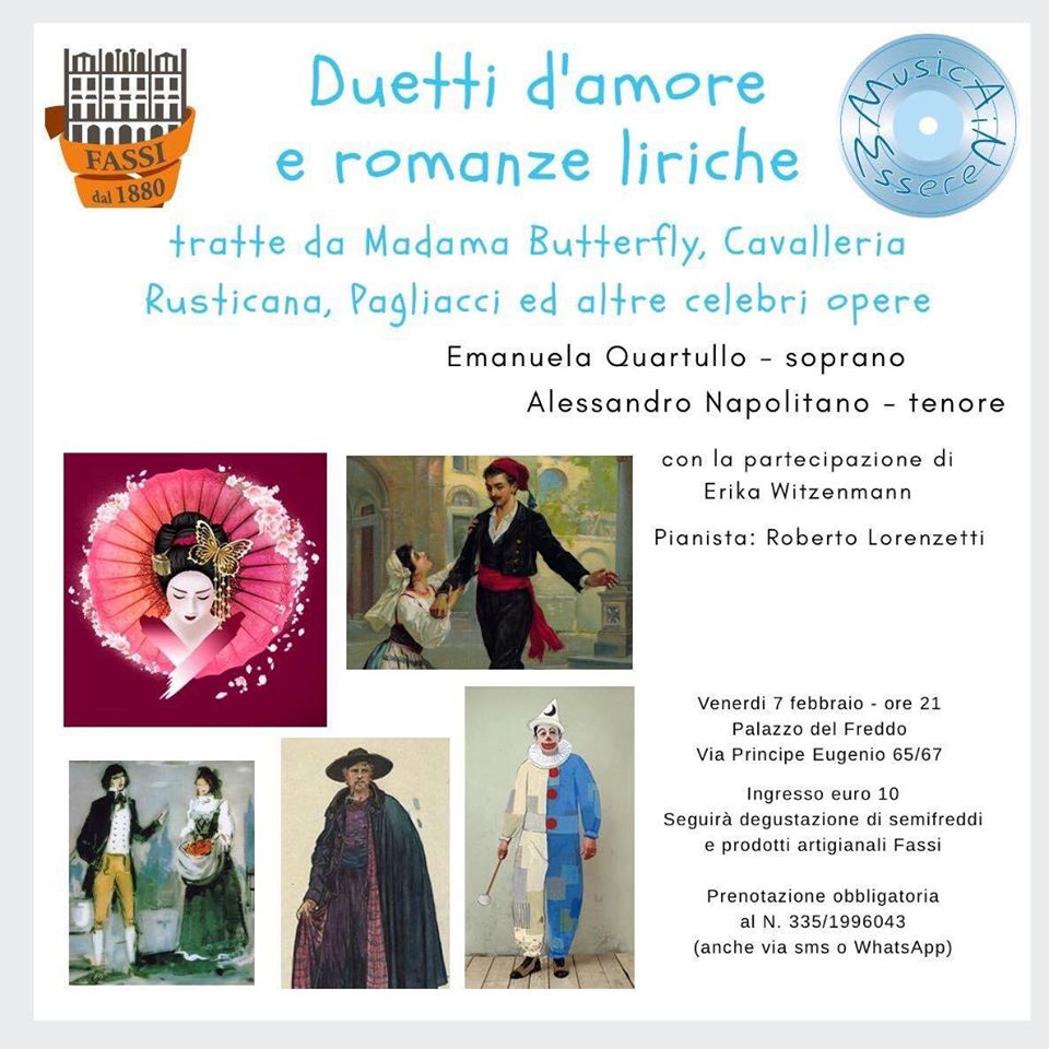 Venerdì 7 Febbraio, alle ore 21, la Sala Giuseppina ospita il concerto “Duetti D’Amore e Romanze Liriche” tratte da Madama Butterfly, Cavalleria Rusticana, Pagliacci e altre celebri Opere.