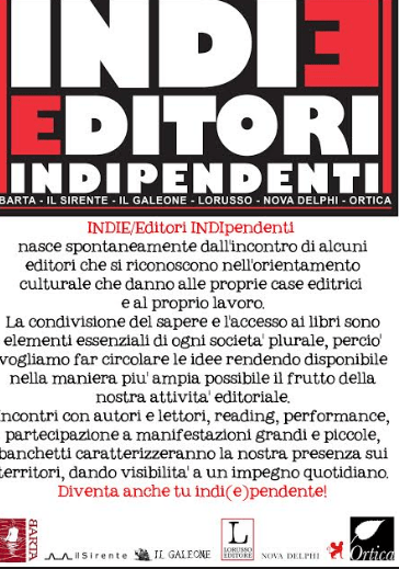 Ospiteremo gli amici di INDIE Editori INDIpendenti, associazione nata spontaneamente dall’incontro di alcuni editori – Il Galeone, Barta, Il Sirente, Lorusso, Nova Delphi e Ortica – che si riconoscono nell’orientamento culturale che danno alle proprie case editrici e al proprio lavoro.