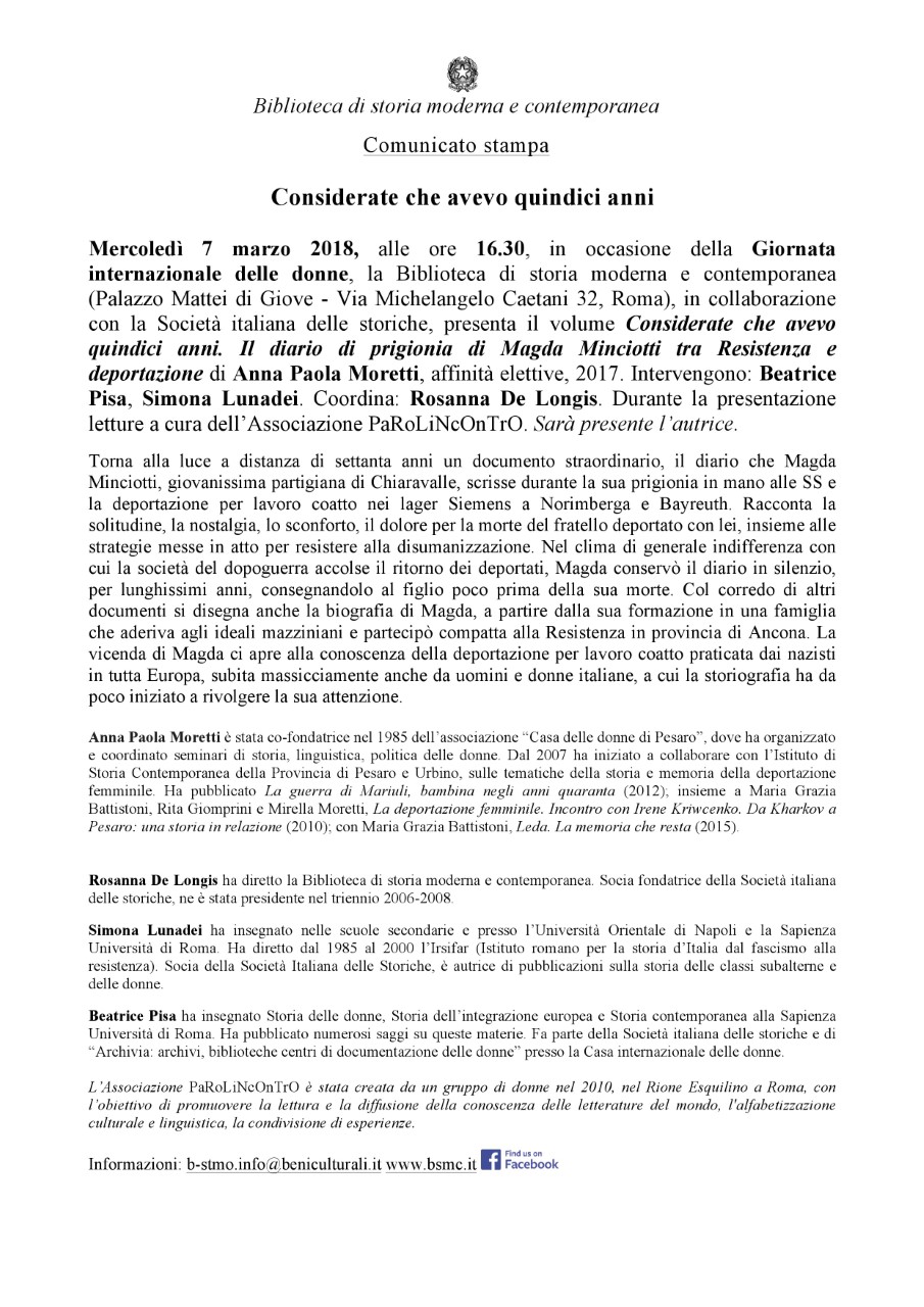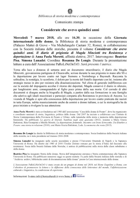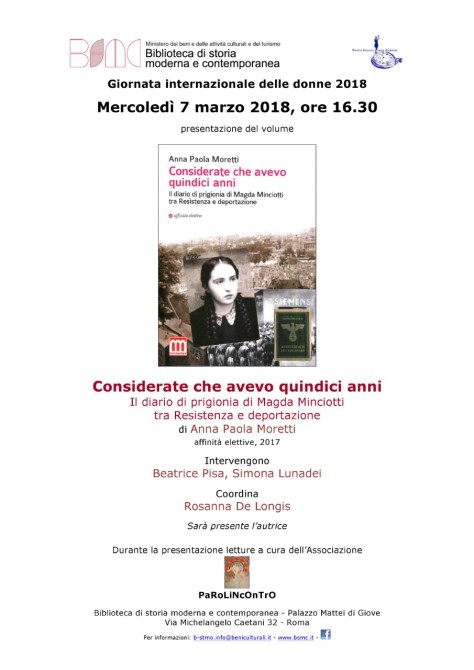 7 marzo 2018 presentazione del libro “Considerate che avevo quindici anni” presso la Biblioteca di Storia Moderna e Contemporanea