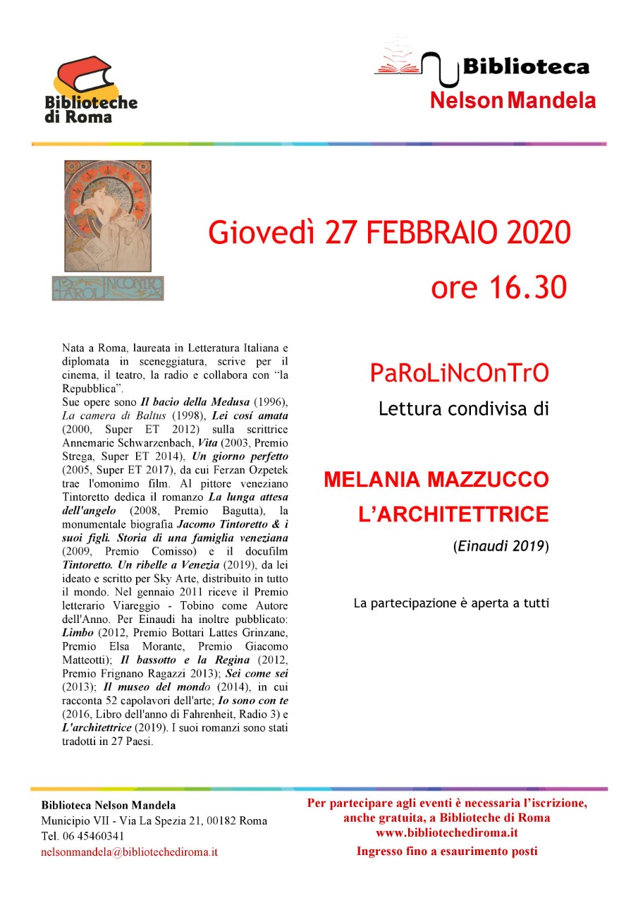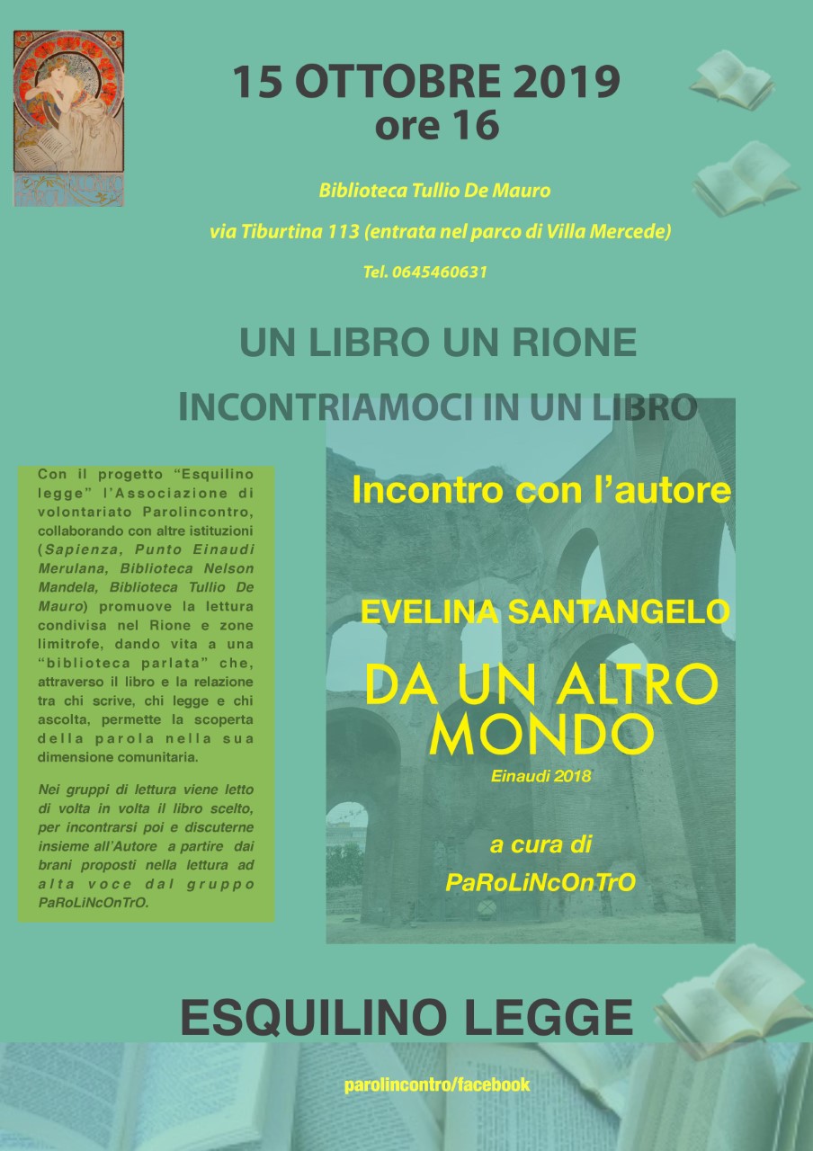 15 ottobre 2019 per “Un libro un Rione – Esquilino legge” incontro con Evelina Santangelo presso la Biblioteca Tullio De Mauro