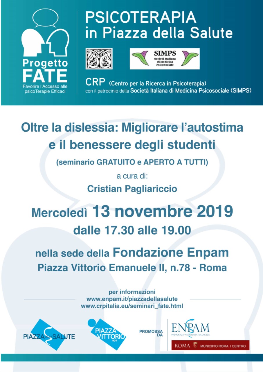 13 novembre 2019 “Oltre la dislessia: Migliorare l’autostima e il benessere degli studenti” nella sede della Fondazione Enpam