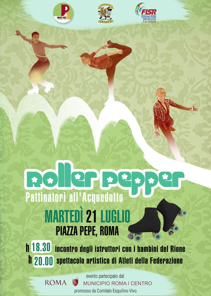 Confortati dal successo dell’asta di solidarietà a sostegno di Portici Aperti e dall’evento musicale “A qualcuno piace freddo” che hanno visto la adesione e partecipazione di moltissime associazioni e realtà sociali attive nel rione Esquilino, abbiamo voluto rilanciare immaginando una manifestazione sportiva di pattinaggio artistico a rotelle con spettacolare partecipazione di atleti pluripremiati in partnership con l’Associazione ASD Pattinaggioroma, referente Bruno Rivaroli, della FISR -Federazione Italiana Sport Rotellistici. La manifestazione dovrebbe svolgersi il 21 luglio nell’area verde antistante l’acquedotto Anio Novo nella cosiddetta piazza Pepe, il titolo sarà Roller-Pepper Pattinatori all’Acquedotto e vedrà le esibizioni di atleti delle società: Pattinaggioroma, Pattinarvalia, Pian Due Torri, Accademia Italiana Pattinaggio.