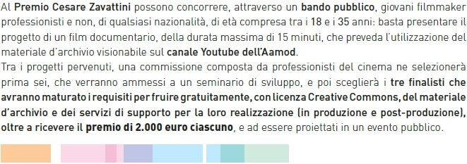Il PREMIO ZAVATTINI 2016 è un’iniziativa per incentivare la conoscenza e il riuso creativo del materiale d’archivio, attraverso un premio in servizi e in denaro a tre progetti di cortometraggio documentario. Al Premio possono concorrere, attraverso un bando pubblico, giovani filmmaker professionisti e non, di qualsiasi nazionalità, di età compresa tra i 18 e i 35 anni: basta presentare il progetto di un film documentario, della durata massima di 15 minuti, che preveda l’utilizzazione del materiale d’archivio VISIONABILE sul canale Youtube dell’Aamod.
