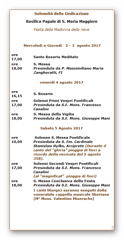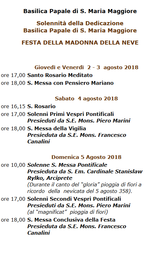 Dalle ore 21.00 alle ore 24.00, si svolge la rievocazione storica del “Miracolo della Madonna della Neve” in piazza di Santa Maria Maggiore. Per l’evento dalle ore 20.30 fino a fine servizio, chiuse al traffico piazza di Santa Maria Maggiore, via dell’ Esquilino, via Liberiana, via Carlo Alberto e via Merulana (da piazza di Santa Maria Maggiore a largo Brancaccio). Deviate le linee 16-70-71-360-590-649-714.