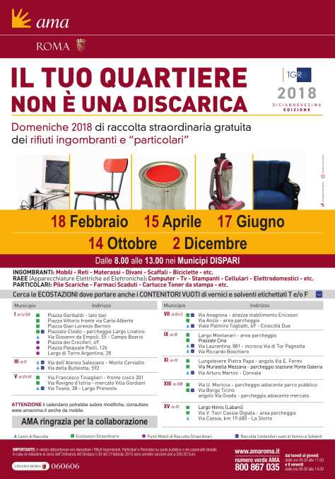 Ama provvederà a differenziare secondo la categoria merceologica (legno, ferro, plastica, altri metalli, ecc.) i rifiuti riciclabili raccolti e ad avviarli alle rispettive filiere di recupero. Si ricorda inoltre che l’azienda mette quotidianamente a disposizione dei cittadini altri due canali per disfarsi gratuitamente dei rifiuti ingombranti, elettrici ed elettronici, che non devono essere assolutamente conferiti nei cassonetti stradali: i 14 centri di raccolta aziendali aperti tutti i giorni e, dallo scorso 1 dicembre, il servizio di ritiro a domicilio al piano strada per i materiali fino a 2 metri cubi di volume. Il servizio può essere prenotato tramite il ChiamaRoma 060606 oppure compilando l’apposito modulo di richiesta nella sezione Servizi on-line