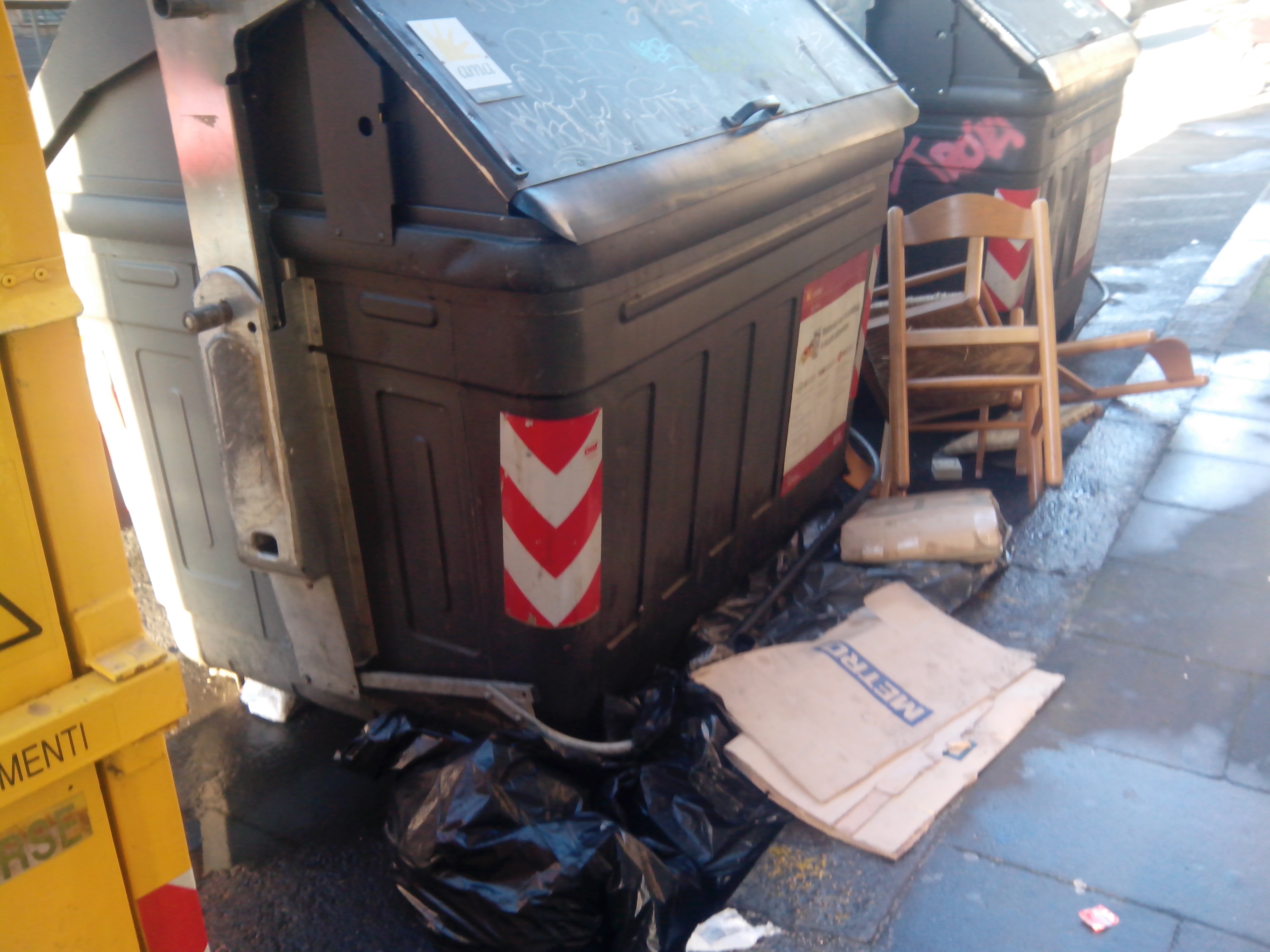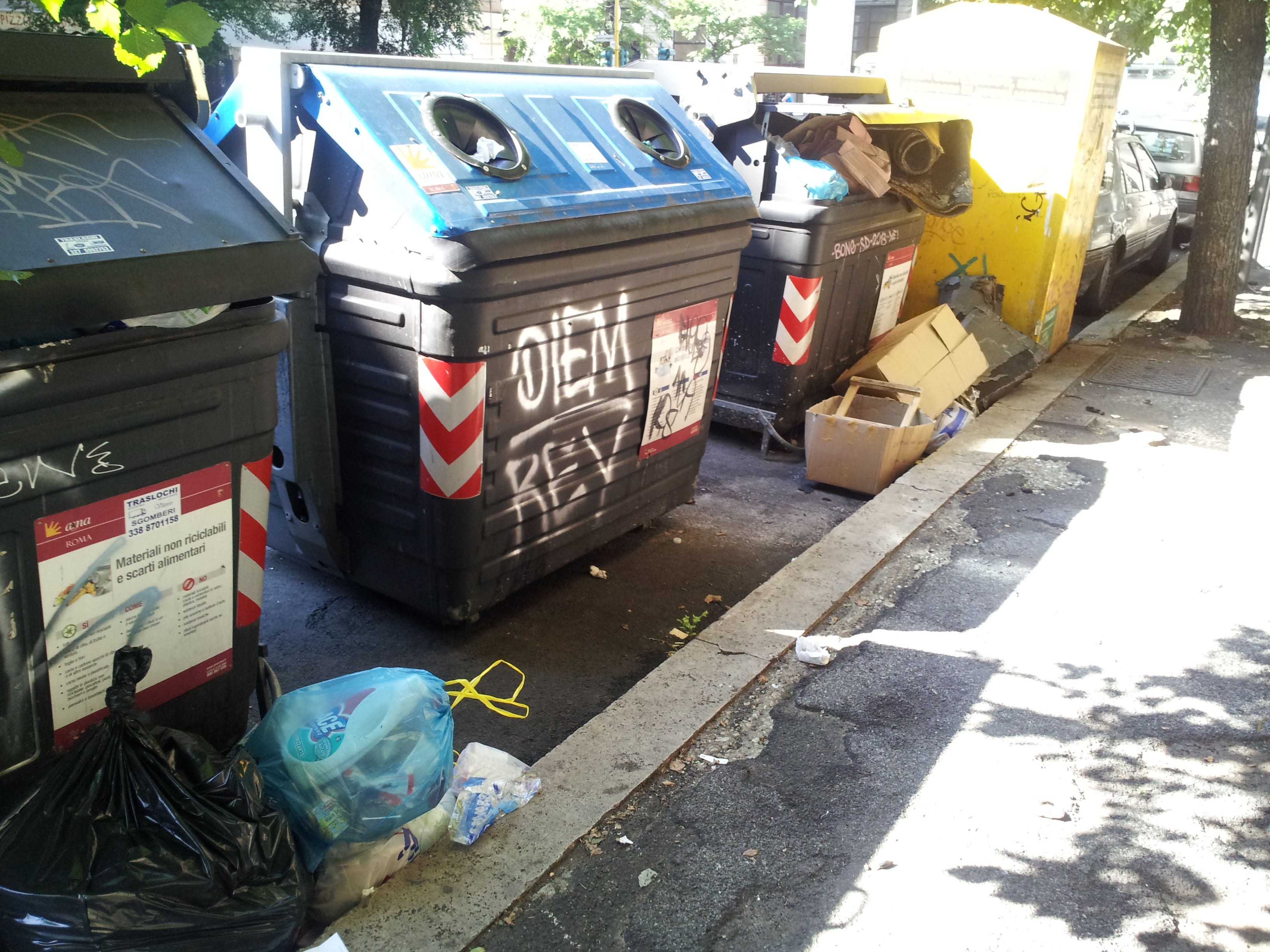 Questi cassonetti hanno ognuno un codice e non sarebbe affatto difficile risalire a chi li ha abbandonati lì e quindi, dopo aver sanzionato i responsabili, si potrebbe benissimo riportarli a chi li doveva detenere nell’esercizio commerciale. Ovviamente diventano un attrazione fatale non solo per gli “zozzoni” ma anche per le persone normali specie se l’AMA ritira il cassonetto dell’indifferenziata e non lo ricolloca da settimane come si vede dalla fotografia