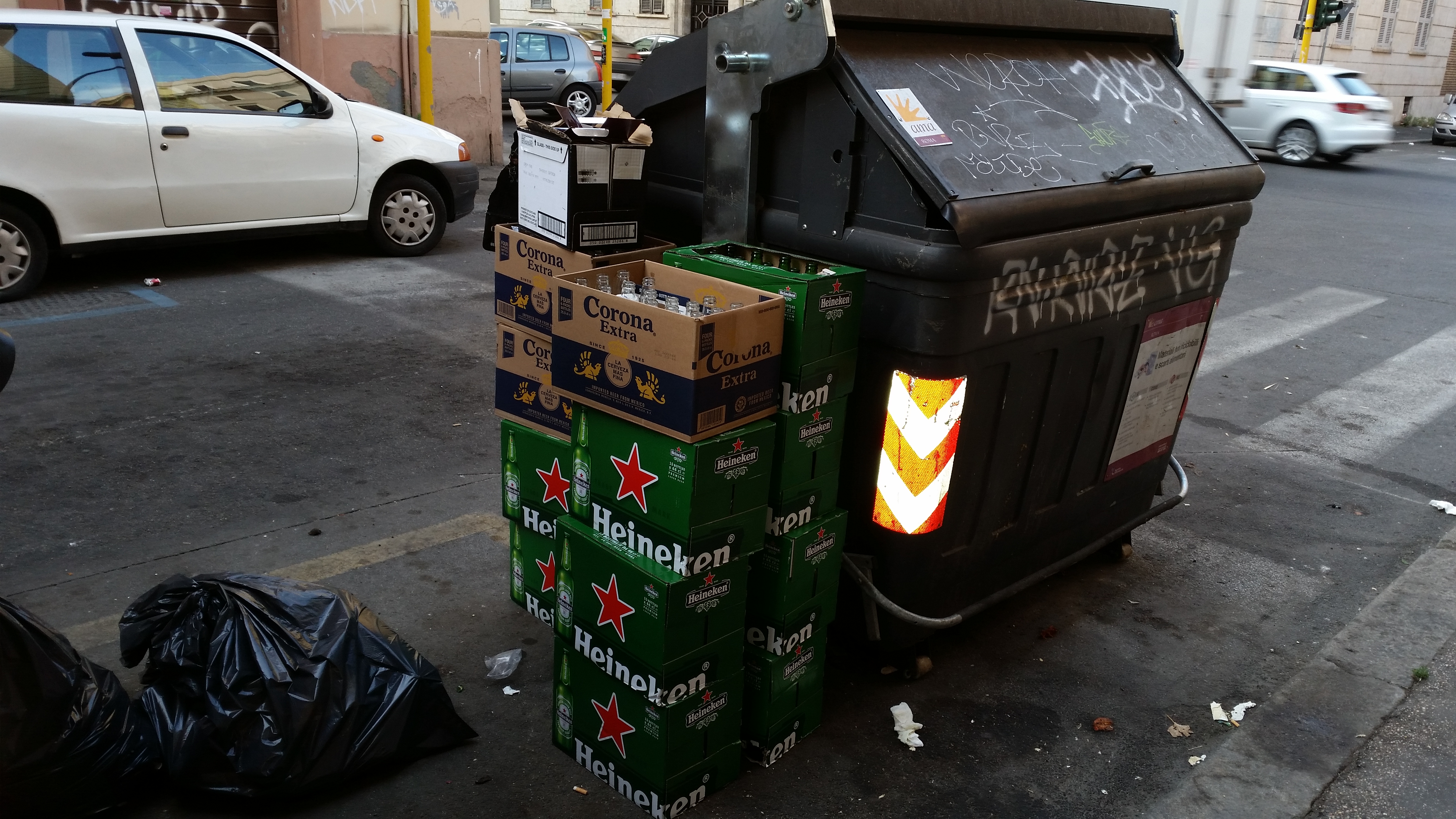 Già alla fine dello scorso anno ricevemmo diverse segnalazioni di protesta riguardo al fenomeno della movida all’Esquilino, problema troppo spesso sottovalutato perchè, a torto, si ritengono altri i luoghi più colpiti (Campo de’ Fiori, S. Lorenzo, Pigneto). In realtà laddove nel rione ci sono dei locali, le (giuste) lamentele dei residenti si sprecano. Schiamazzi notturni, liti furibonde sedate solo dall’arrivo delle Forze dell’Ordine, musica ad alto volume ma non sono solo questi gli aspetti negativi della movida all’Esquilino c’è anche il problema dei rifiuti : ecco come si presentano in genere i cassonetti a via Bixio il giorno dopo di una notte brava al locale di via Principe Umberto. Centinaia di bottiglie vuote di birra e sacchi di spazzatura il tutto rigorosamente fuori dai cassonetti