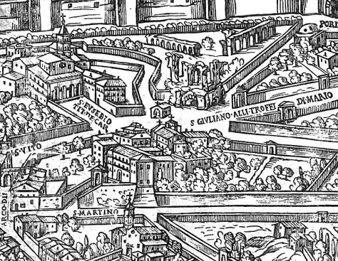 Nel quartiere dell’Esquilino, tra l’Arco di Gallieno e i Trofei di Mario, c’era la chiesa di San Giuliano, di fronte a Sant’Eusebio. Questa chiesa, con le strutture annesse, già citata nel 1220, venne demolita nel 1874, per realizzare piazza Vittorio. Nel 1601 erano stati effettuati, dai frati della chiesa, alcuni scavi per disseppellire dei ruderi di un’antica domus romana, adiacente alla chiesa. Venne così alla luce uno degli affreschi più belli dell’epoca di Augusto, di 2,40 metri. Il cardinale Pietro Aldobrandini acquistò subito l’opera dai frati e la fece trasferire nella sua villa a Magnanapoli. Fu quindi battezzata “ Le Nozze Aldobrandini”. L’opera nel 1818 aveva rischiato di essere venduta all’estero, ma, su pressione del Canova, Pio VII esercitò il diritto di prelazione e la fece collocare nella Biblioteca Vaticana, dove è tutt’ora visibile. La chiesa di San Giuliano è visibile nel disegno del Falda del 1676.