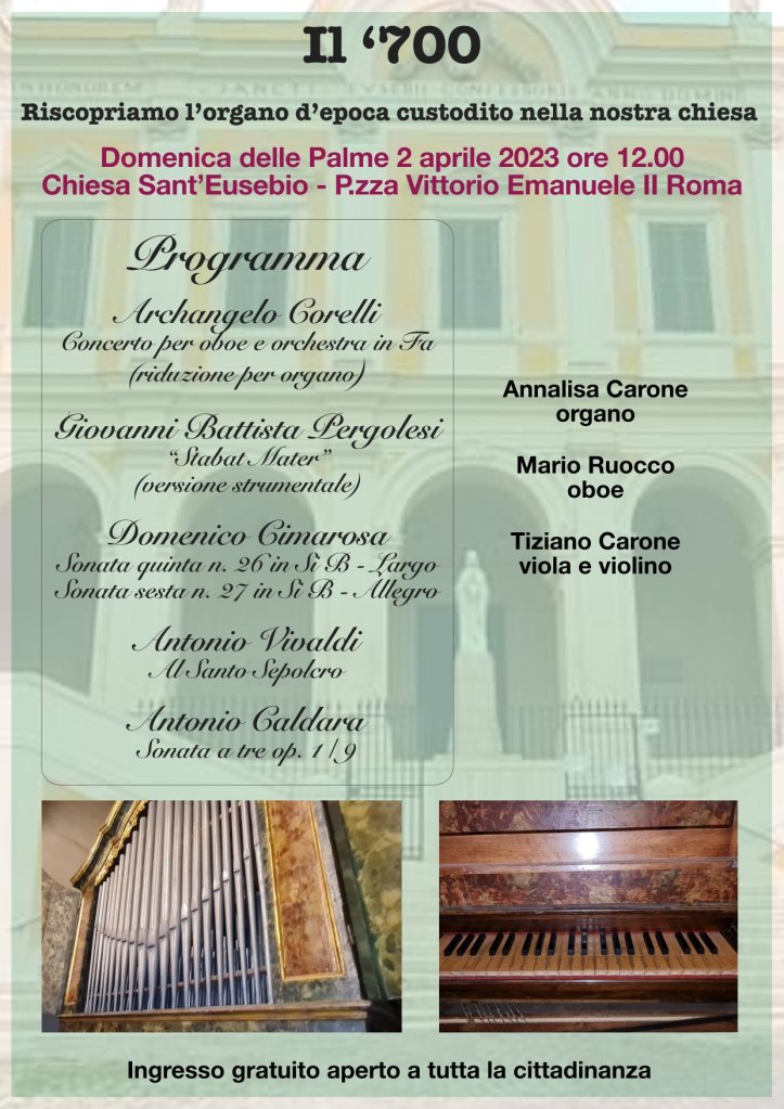 «Questo evento – spiegano dalla parrocchia – ha lo scopo di valorizzare e di portare a conoscenza di un pubblico ampio due strumenti che, sebbene a lungo dimenticati, costituiscono parte del patrimonio culturale e musicale della città». L’iniziativa è organizzata dal gruppo parrocchiale Comitato Eventi S. Eusebio all’Esquilino, con l’obiettivo dell’iniziativa è anche promuovere il recupero e il restauro dei due organi. Si esibiranno i tre musicisti Annalisa Carone, Mario Ruocco e Tiziano Carone, che daranno voce agli strumenti con musiche del barocco italiano: da Pergolesi a Cimarosa, passando per Vivaldi, Caldara, Corelli.