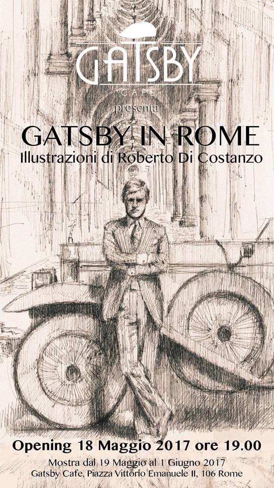 Il 18 Maggio dalle 19.00 si inaugura l’ultima personale dell’artista, ritrattista illustratore Roberto Di Costanzo dal titolo “GATSBY IN ROME” nel Caffè Gatsby, ex cappellificio Venturini ora nuovo cuore pulsante del quartiere Esquilino. L’esposizione che si compone di otto illustrazioni ad inchiostro di china ed acquarello, intende rievocare i protagonisti del celebre film “Il Grande Gatby” del 1974 con Robert Redford e Mia Farrow, in un visionario tour romano che celebra l’eleganza d’altri tempi. Allievo del Maestro Piero Tosi, esperto di filologia del costume, l’artista attraversa in questa esposizione lo studio sugli anni ’20 nel ritmo del jazz di una Long Island che si fa Roma.