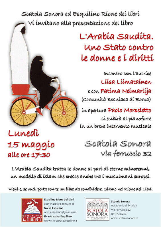 Per il prossimo lunedì, dalle 17:30, vi invitiamo a partecipare alla presentazione del libro “L’Arabia Saudita. Uno Stato contro le donne e i diritti“. Assieme all’autrice Liisa Liimatainen parteciperà Fatima Neimarlija della Comunità Bosniaca di Roma.