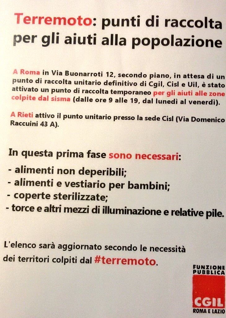 Quello che è successo nella notte tra il 23 e il 24 agosto ci ha scosso e profondamente segnato. Le immagini di distruzione e desolazione che avevamo già visto per il terremoto de L’Aquila sono tornate prepotentemente alla ribalta. Paesi rasi al suolo e di fatto cancellati, storie di intere famiglie che non ci sono più, persone che in attimo hanno perso tutto. E’ dura, e continuare a parlare dei problemi del nostro Rione in questo momento ci sembra difficile. Ma si deve andare avanti anche nel rispetto dei tanti che hanno perso la vita , degli innumerevoli feriti e di tutti coloro che dovranno fare i conti con una casa o un posto di lavoro che non c’è più. Per questo vorremmo indicare sia dei punti di raccolta ufficiali, dove recarsi per offrire anche un piccolo aiuto per tamponare l’emergenza di questi primi, terribili momenti, sia altri modi per cercare di offrire il proprio contributo di solidarietà. Tante gocce di acqua fanno un oceano….