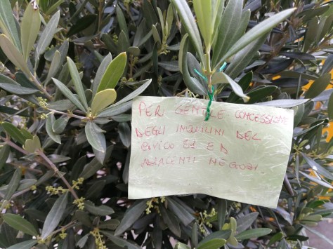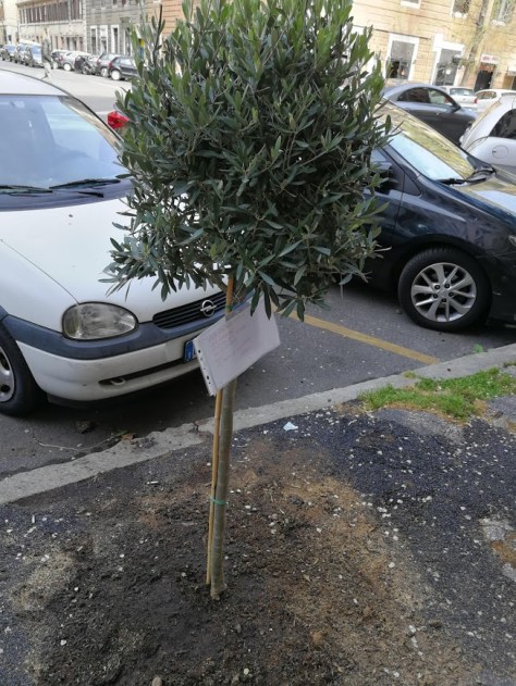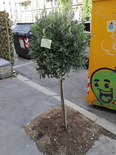 Ma questa volta alcuni residenti e alcuni esercizi commenrciali hanno deciso che era troppo e bisognava fare qualcosa per ridonare a un tratto viale Manzoni quella che dovrebbe essere l’essenza di un viale, cioè glli alberi e quindi sono stati piantati due piccoli ulivi.