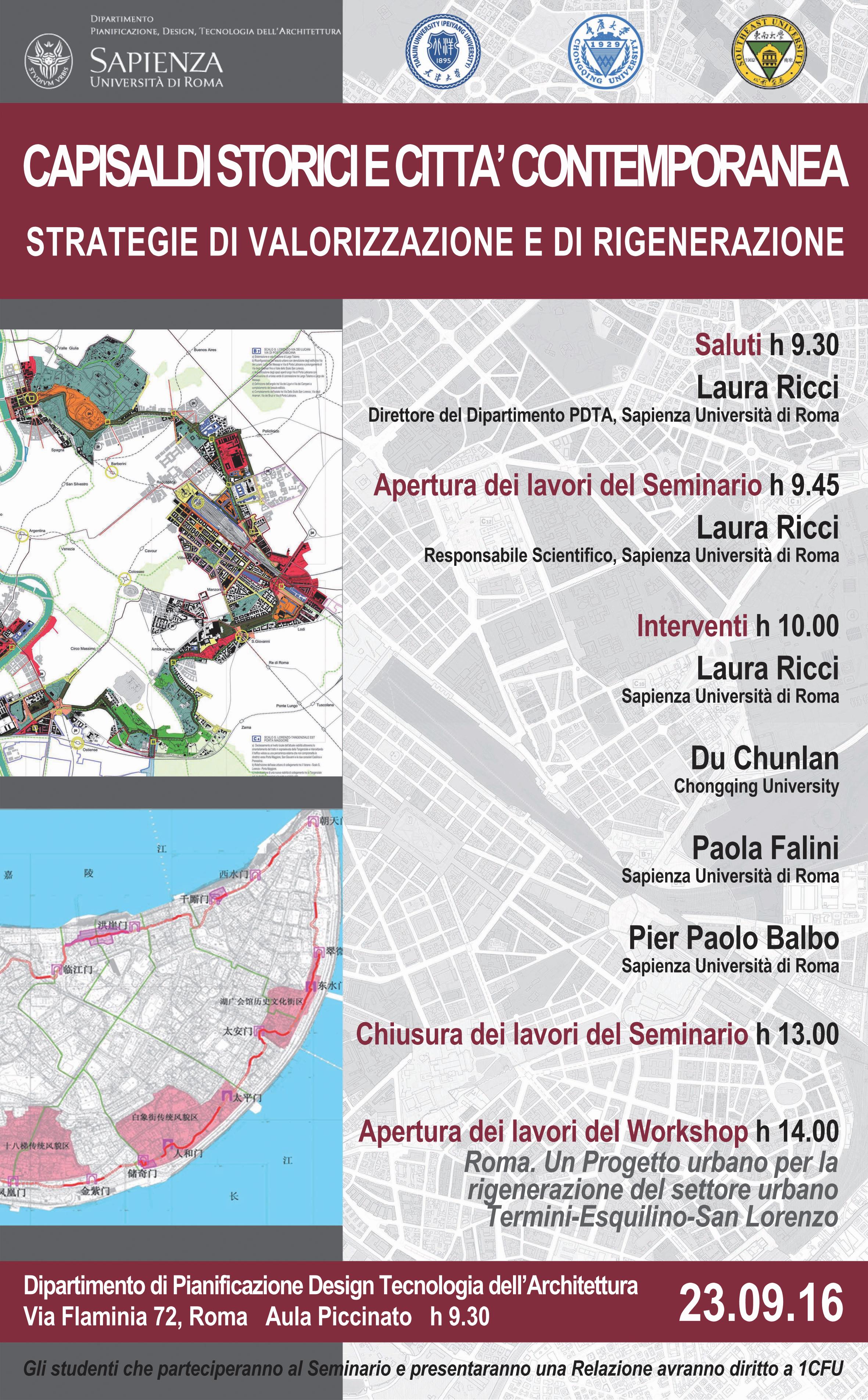 Venerdì 23 settembre si svolge, presso il dipartimento Pdta – Pianificazione, design, tecnologia dell’architettura – il seminario internazionale “Capisaldi storici e città contemporanea. Strategie di valorizzazione e di rigenerazione”. L’evento è organizzato dalla Sapienza in collaborazione con la Southeast University of Nanjing, la Tianjing university e la Chongqing University. Segue un workshop internazionale, dedicato al tema della rigenerazione del settore urbano Termini – Esquilino – San Lorenzo, a cui possono lavorare gli studenti di tutti gli atenei promotori del seminario. Coloro che partecipano all’evento e presentano una relazione hanno diritto a 1 CFU.